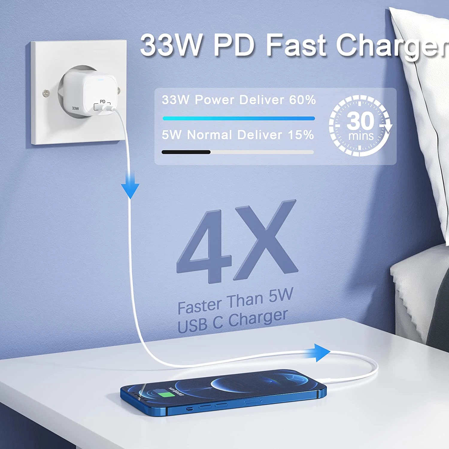 Notre Chargeur Secteur dispose d’une grande puissance de 33 Watts lui permettant de recharger un iPhone de 13 % à 60 % en seulement 30 minutes. Conçu à partir de matériaux ignifuge, il est également résistant à la chaleur ❤️.