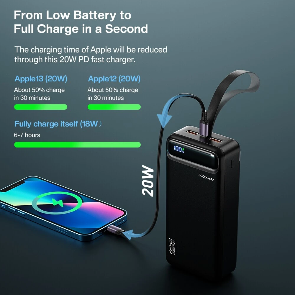 Notre Power Bank Asometech de 30 000 mAh dispose de la charge ultra rapide rechargeant par exemple un iPhone 13 à moitié en seulement une demi heure et se recharge elle-même entièrement en une nuit seulement (6-7 heures) ❤️.
