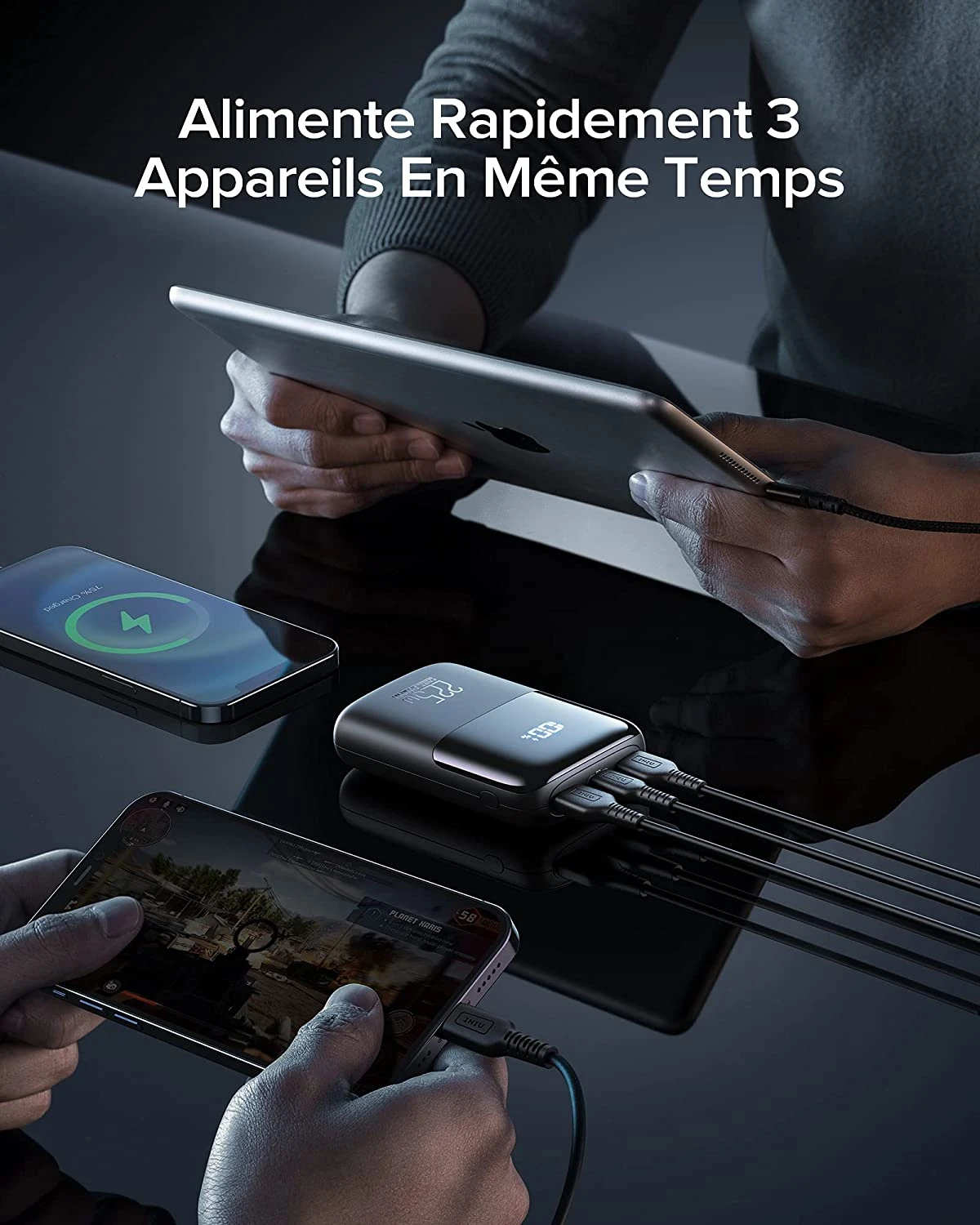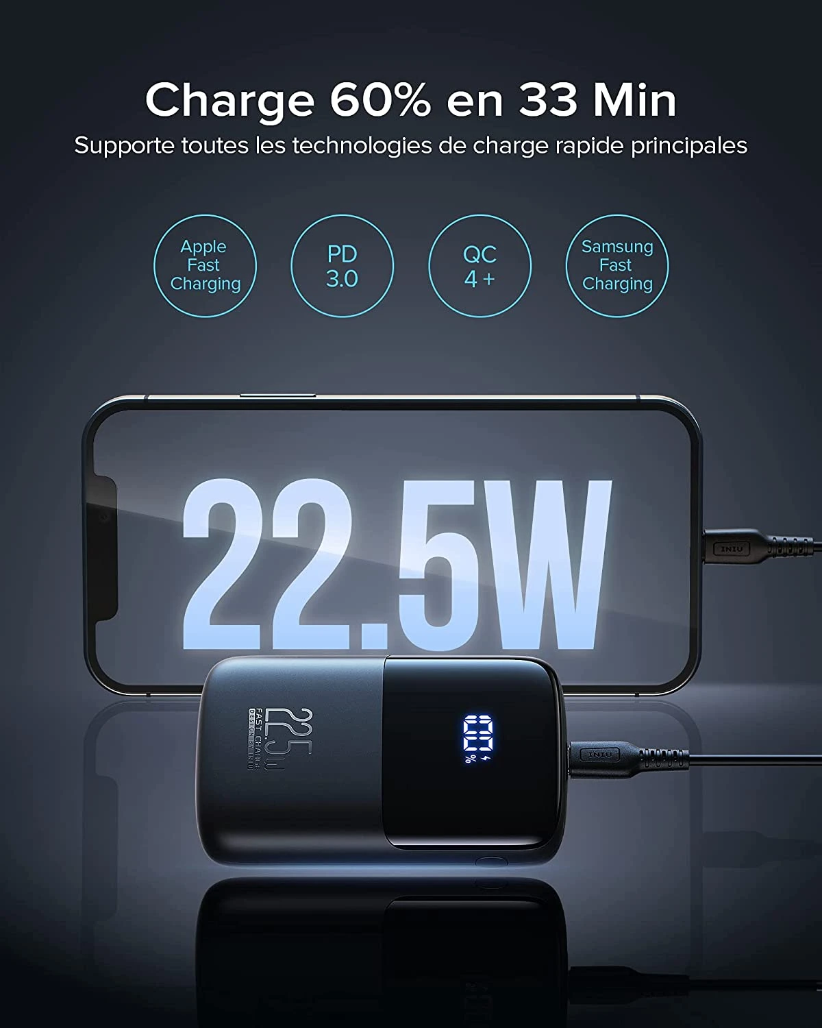 Notre Power Bank de 10000 mAh a une puissance énorme de 22.5 Watts permettant une charge ultra rapide de votre téléphone portable. Elle recharge par exemple un iPhone 13 de 0% à 60% en seulement ~35 minutes ❤️. Confiant de la qualité de nos produits, une garantie de 3 ans est offerte à l’achat de ce produit et un service client reste à votre disposition en cas de quelconque problème .