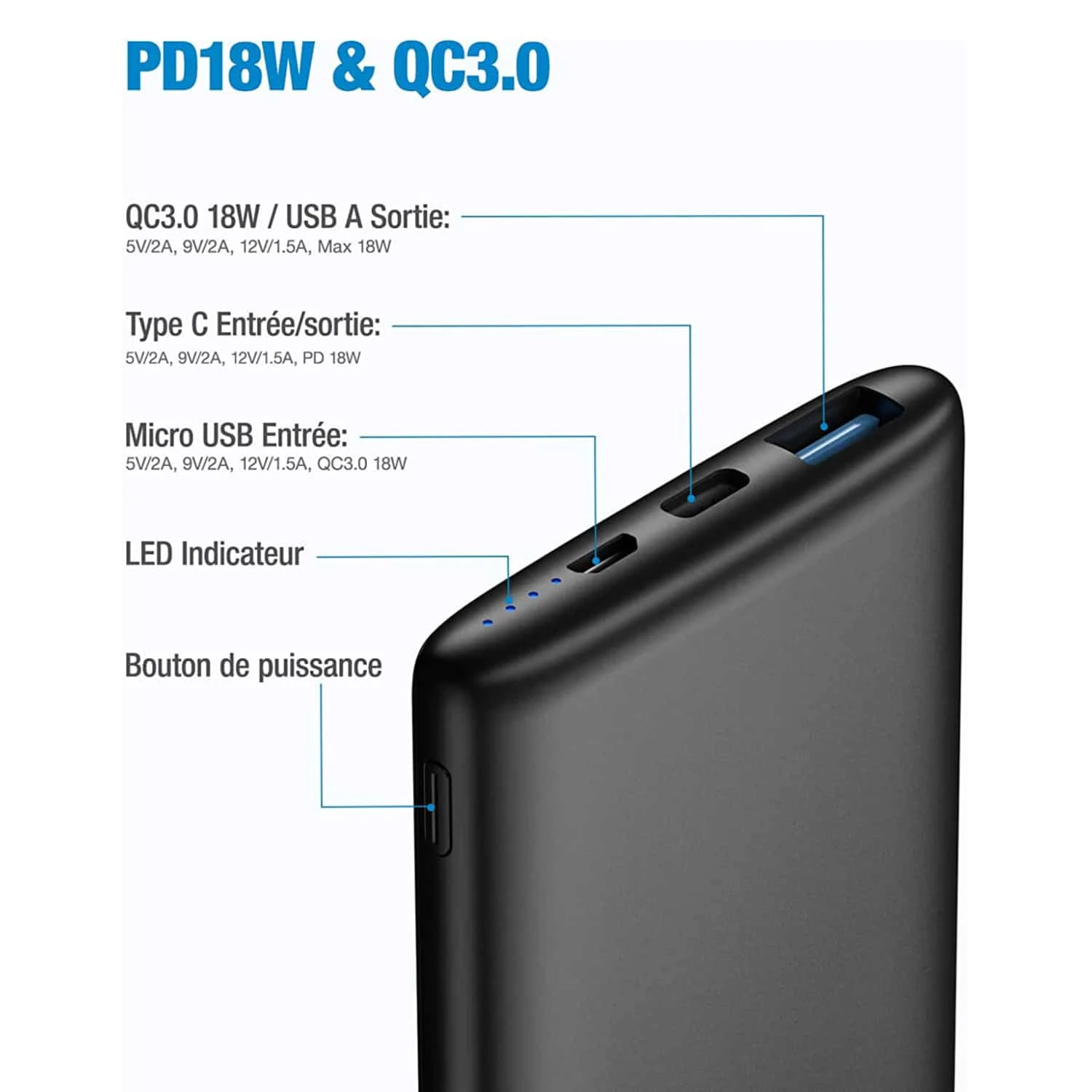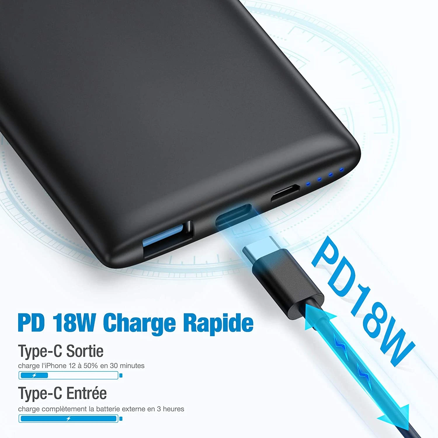 Notre Batterie Externe 10000mAh est Ultra Mince avec une épaisseur de seulement 15 millimètres mais reste très performante ⚡. Grâce aux technologies QC3.0 et PD18W, elle recharge n’importe quel smartphone de 0% à 50% en seulement ~35 minutes et recharge 2-3 fois un téléphone avant de se vider . Confiant de la qualité de nos produits, elle est garantie 2 ans et un service client est à votre disposition pour répondre à toutes vos questions .