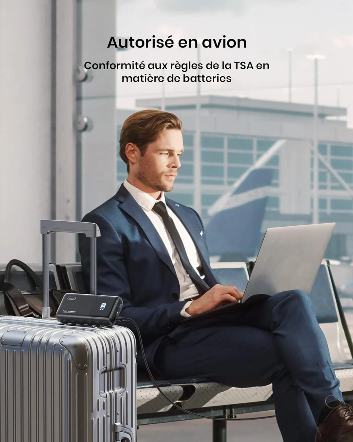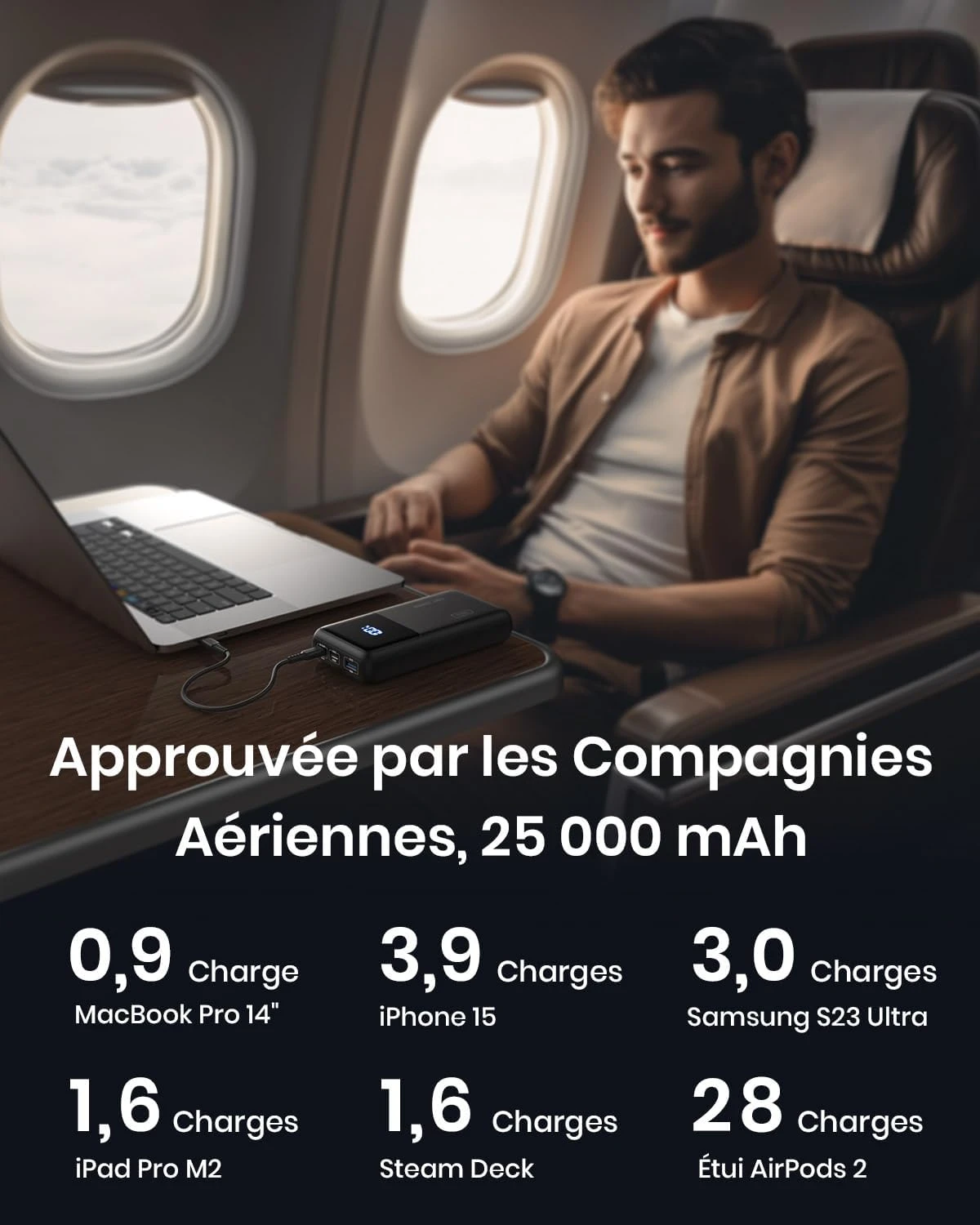 🔋 Capacité de 25 000 mAh, adaptée aux voyages en avion