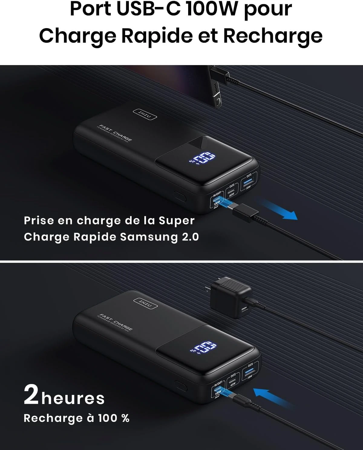 Avec notre batterie externe 100W, bénéficiez d’une solution de charge rapide, sécurisée et portable, conçue pour vous accompagner dans tous vos déplacements. Restez connecté, productif et diverti où que vous soyez.