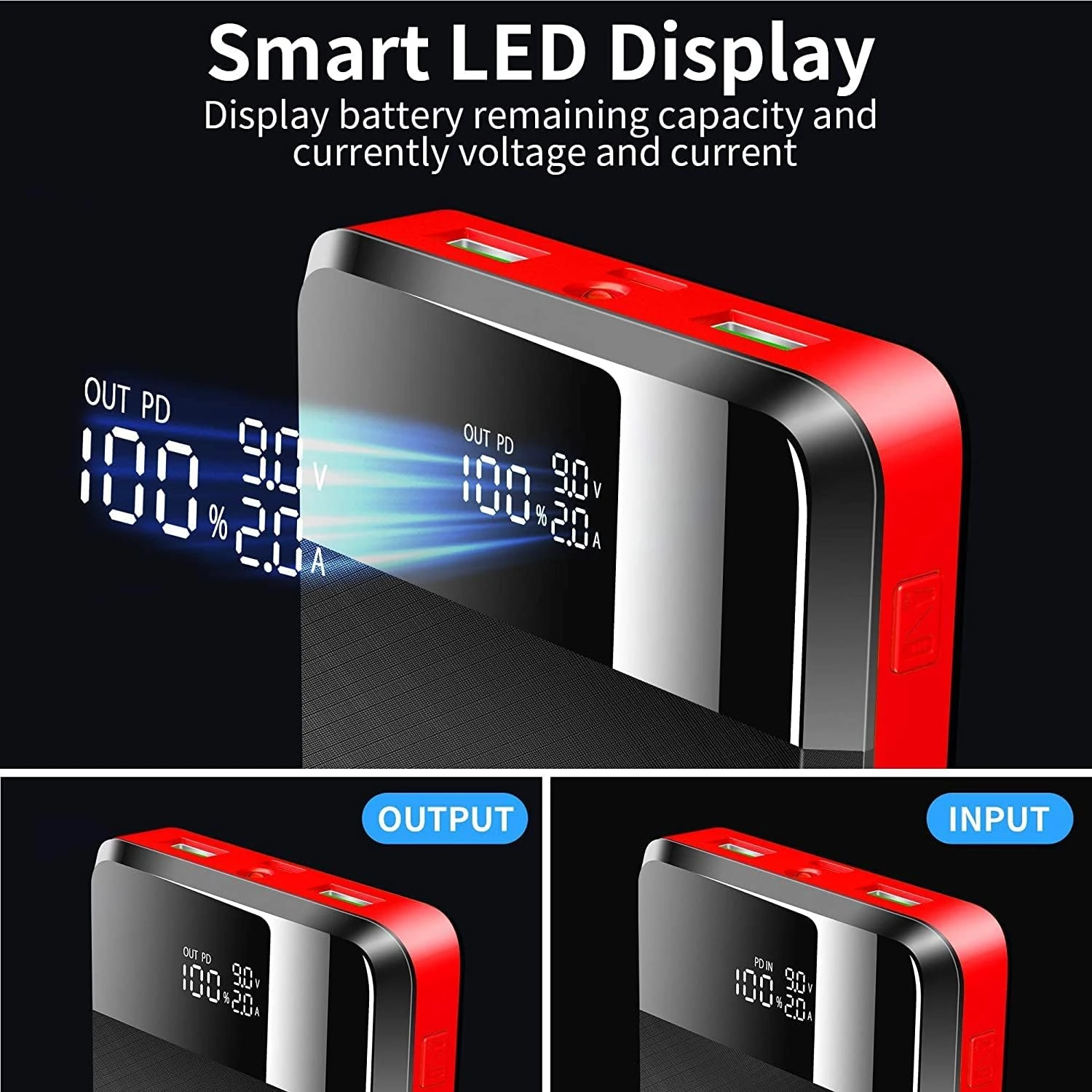💡 Affichage LED et Lampe de Poche Intégrée : L’écran LED affiche en temps réel la tension/courant d’entrée/sortie, assurant une surveillance pratique de l’état de la batterie. La lampe de poche à LED intégrée est idéale pour une utilisation nocturne ou dans des environnements sombres, ajoutant une fonctionnalité supplémentaire à cette batterie externe.