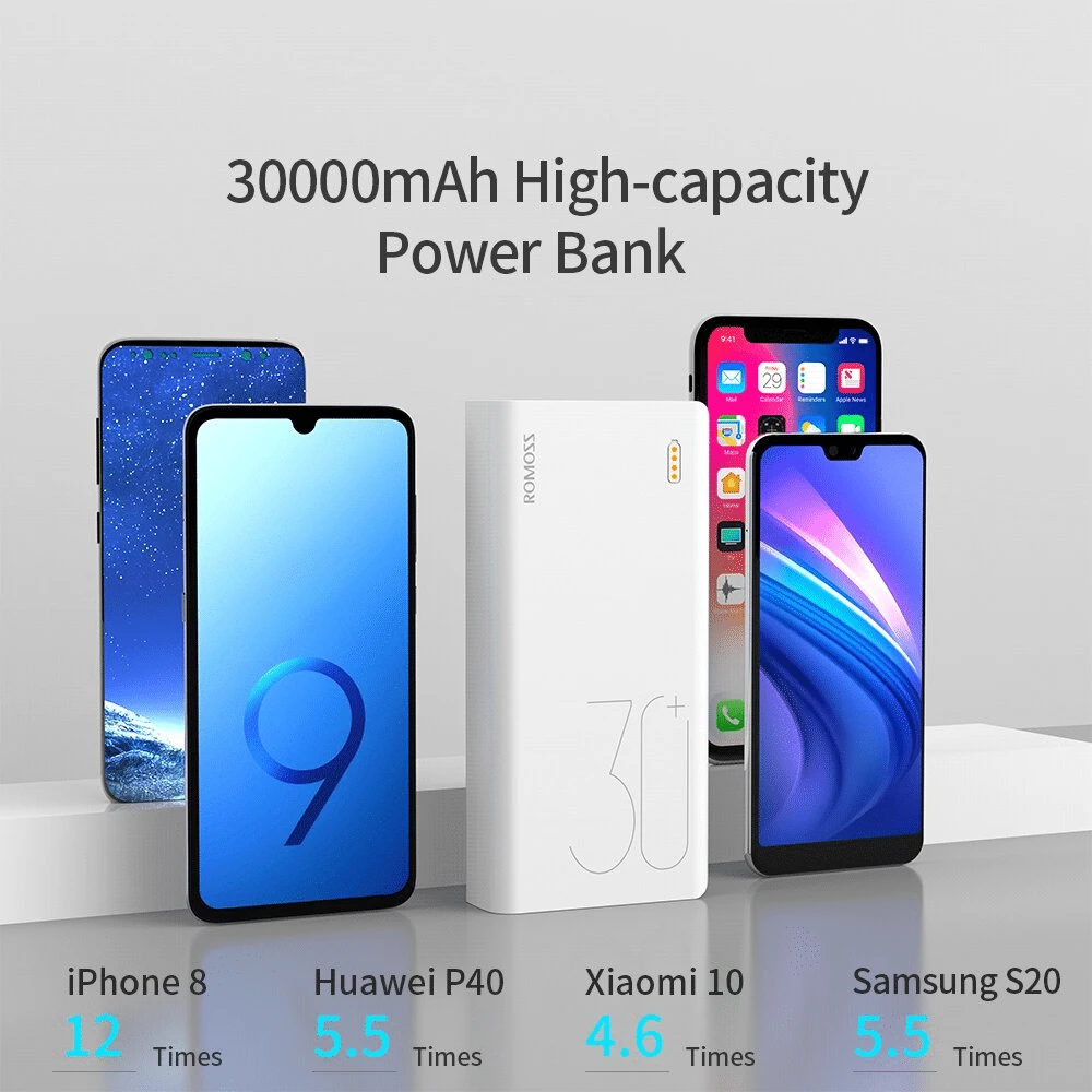 Notre Batterie Externe de la fameuse marque Romoss (Sense 8+) a une puissance de 18 Watts permettant de recharger très rapidement un smartphone de n’importe quelle marque (Apple, Samsung, Huawei, Xiaomi, etc.) ❤️.
