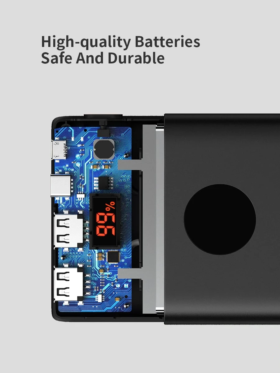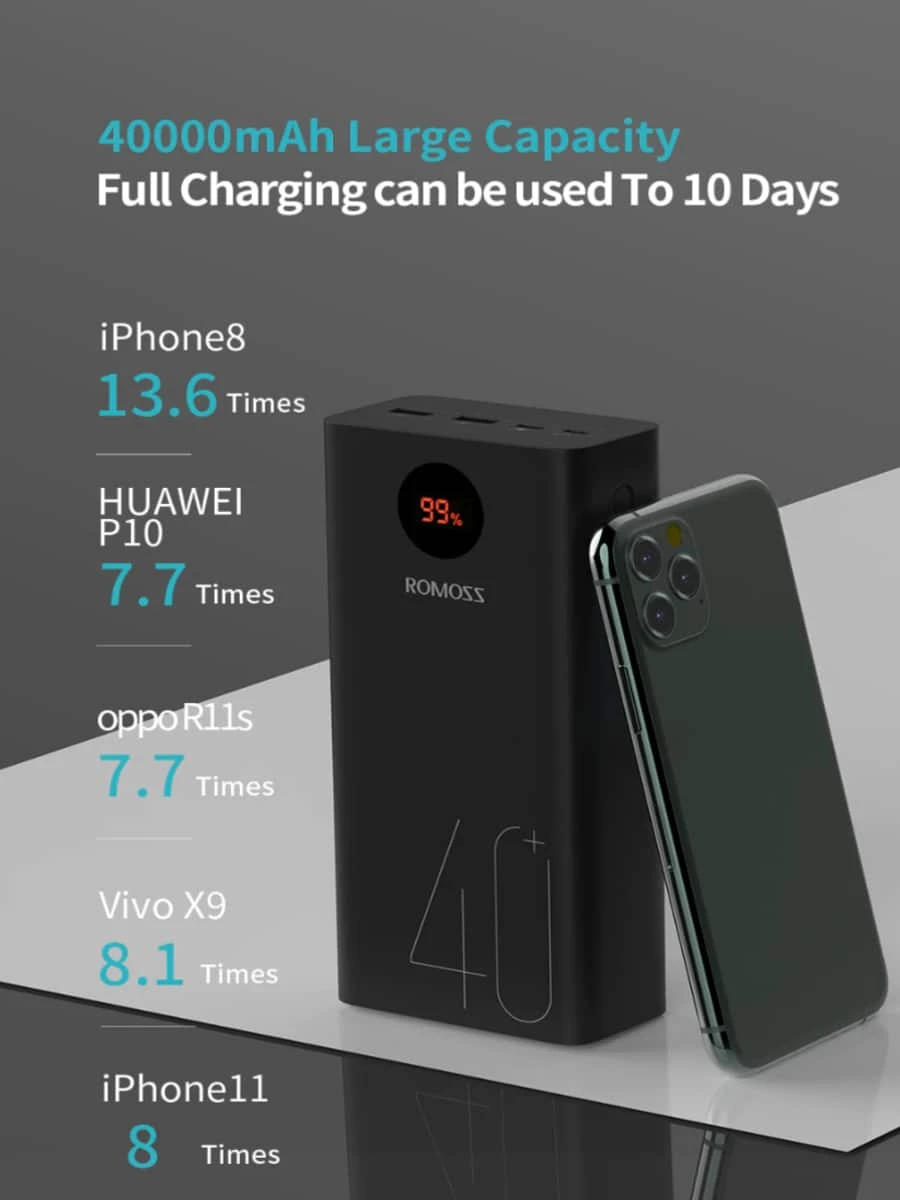 Découvrez dès maintenant notre Batterie Externe d’une capacité énorme de 40 000 mAh. Une fois pleine, elle recharge en moyenne un smartphone 8 à 11 fois avant de se vider (8 fois un iPhone 11, 7,7 fois un HUAWEI P10 ou encore 13.6 fois un iPhone 8 pour être plus précis ), ce qui permet à votre smartphone de tenir plusieurs jours avant d’atteindre les 0% et en fait le compagnon parfait lors d’un voyage .