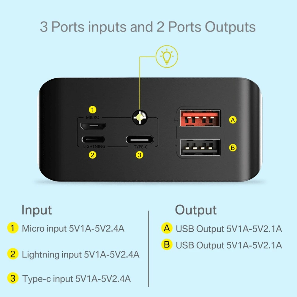 Notre Batterie Externe 50000mAh TopX a une entrée nominale de DC5V 2.1A avec un taux de transformation de ~85% et peut ainsi recharger super rapidement plusieurs smartphones en même temps de différentes marques sans soucis 😊.