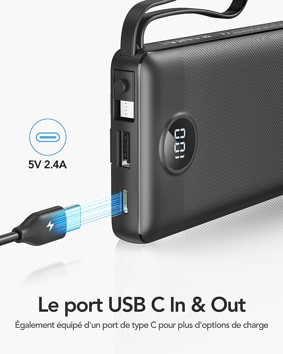 Avec 5 sorties, dont 3 câbles et ports USB A/USB C, notre batterie externe est compatible avec tous les téléphones et bien d’autres appareils. De plus, elle offre 2 options de recharge rapide grâce à ses 2 ports d’entrée (1 port USB C et 1 câble USB). Vous avez ainsi la flexibilité de choisir la méthode de recharge qui vous convient le mieux.