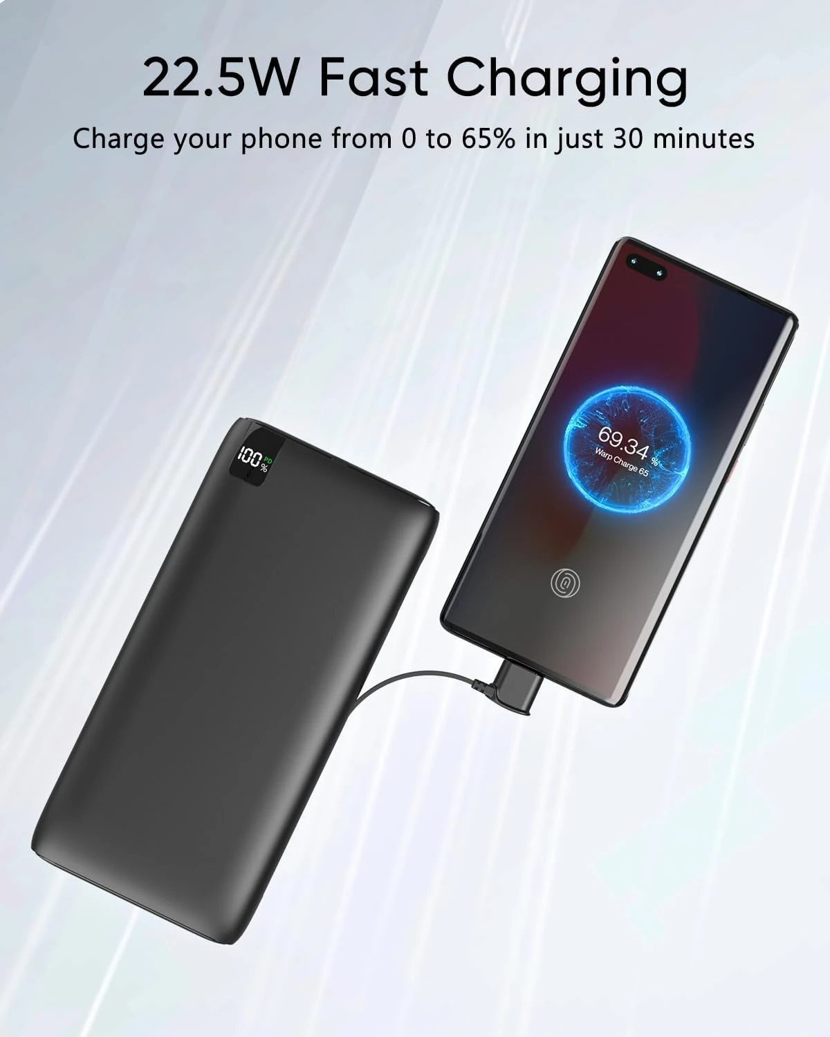 De plus, cette batterie externe offre une charge rapide de 22,5 W grâce aux technologies avancées PD et QC 3.0. Vous pouvez dire adieu aux longues attentes pour que votre téléphone se recharge, car vous pouvez passer de 0 à 65 % de charge en seulement 30 minutes.