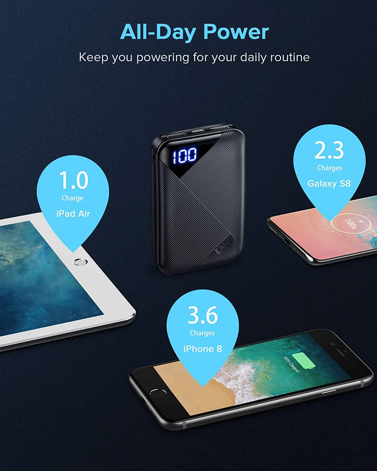 | Capacité : Recharge un iPhone 8 3,6 fois ou un Galaxy S8 2,3 fois | |