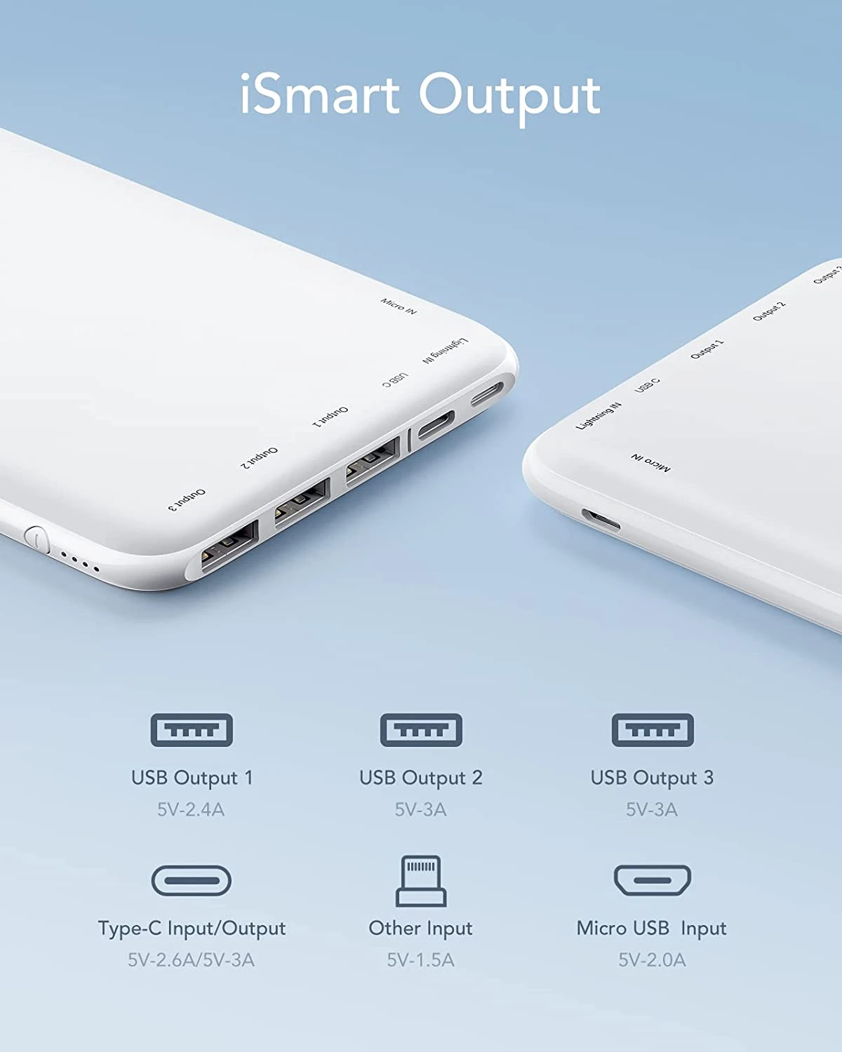 Notre Batterie Externe Fine Et Puissante est équipée de multiples ports d’entrée pour la recharge et de quatre ports de sortie USB, dont un port USB C et trois ports USB A, avec la technologie Smart Identification. Cette fonctionnalité intelligente détecte automatiquement et ajuste le courant de charge pour obtenir une charge plus rapide et plus efficace 👍.