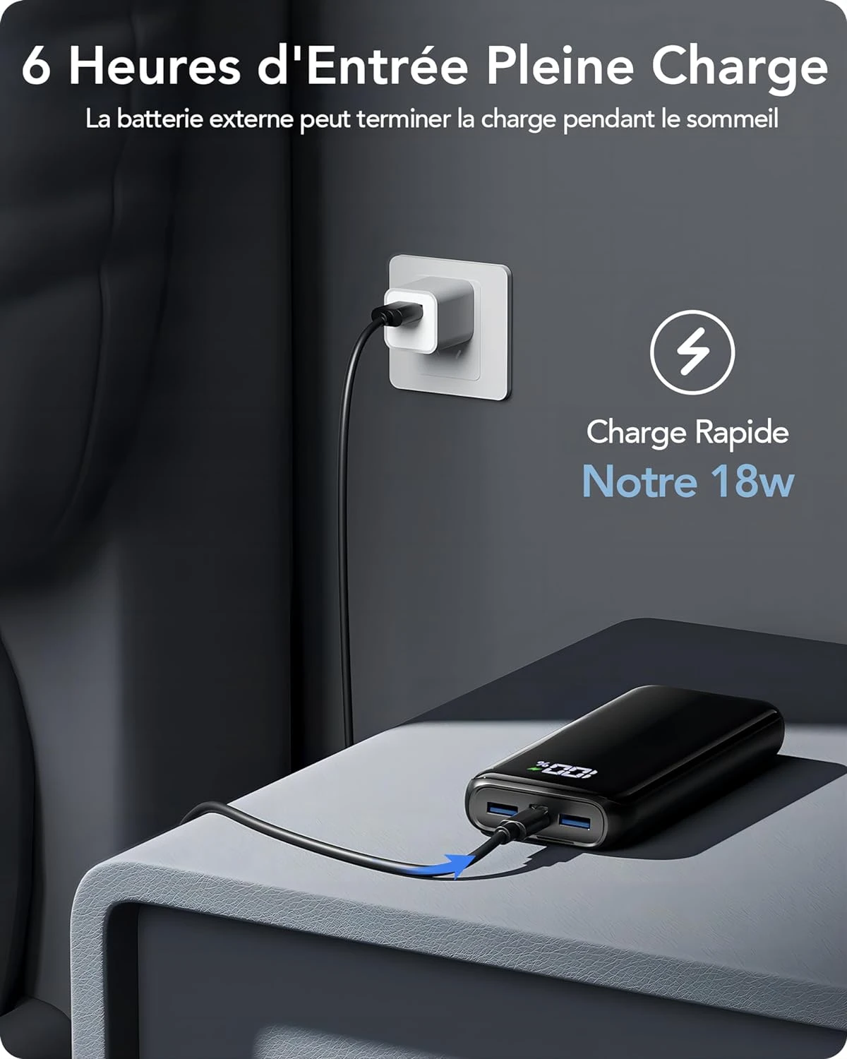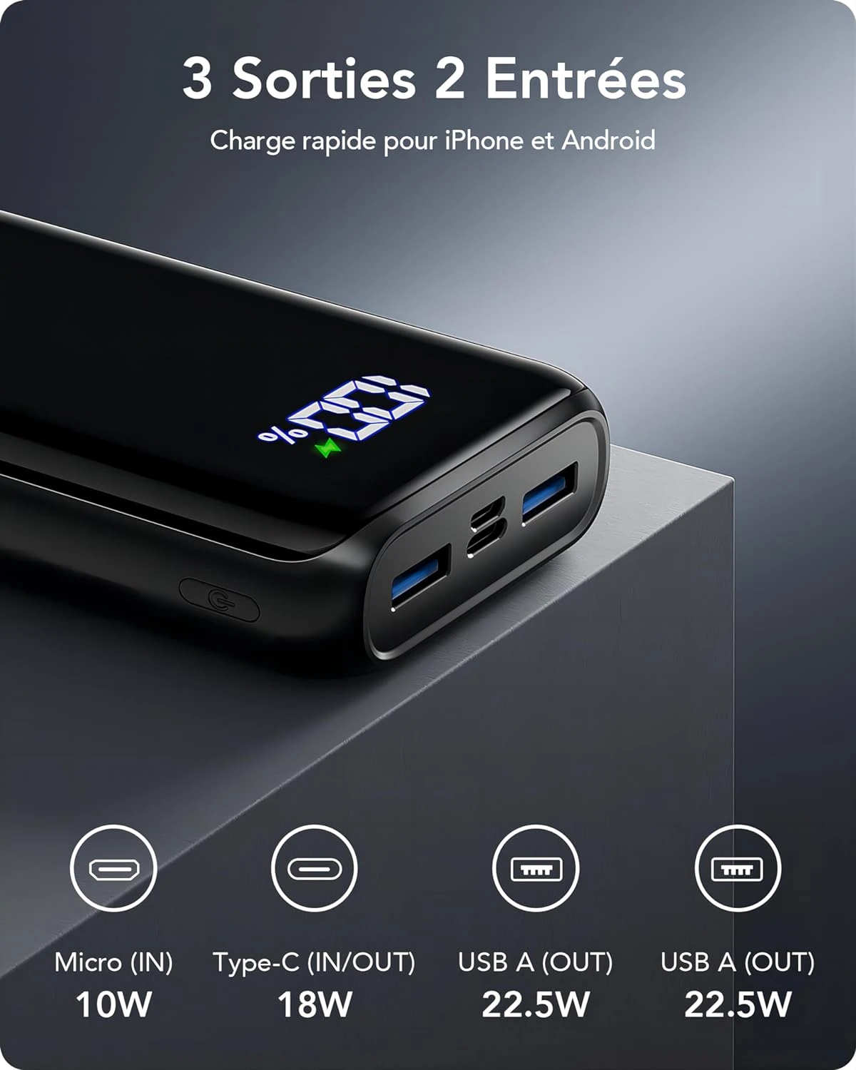 3 Sorties & 2 Entrées : ✨ Notre batterie externe dispose de 3 sorties et 2 entrées pour une flexibilité maximale. Elle comprend un port USB-C de 18W pour l’entrée et la sortie, ainsi que deux ports USB-A PD de 22,5W pour la charge rapide. Chargez jusqu’à 3 appareils simultanément et partagez l’énergie avec vos amis, tout en optimisant l’efficacité de la charge.