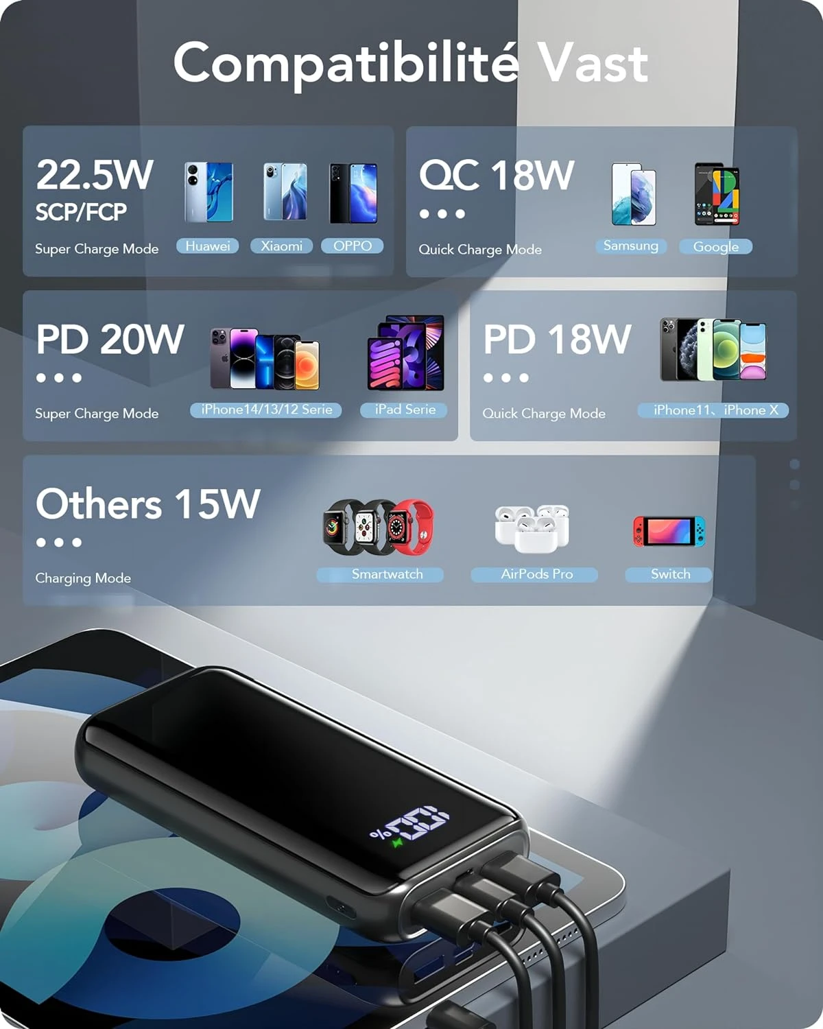 Véritable 20000mAh PowerBank : 🔋 Avec sa capacité impressionnante de 20000mAh, notre batterie externe peut recharger un iPhone 14 jusqu’à 4,6 fois et un iPad jusqu’à 2,9 fois. Profitez d’une autonomie prolongée et de recharges jusqu’à 4 fois plus rapides que les batteries traditionnelles. Que vous soyez en voyage ou en camping, cette batterie est votre alliée incontournable.