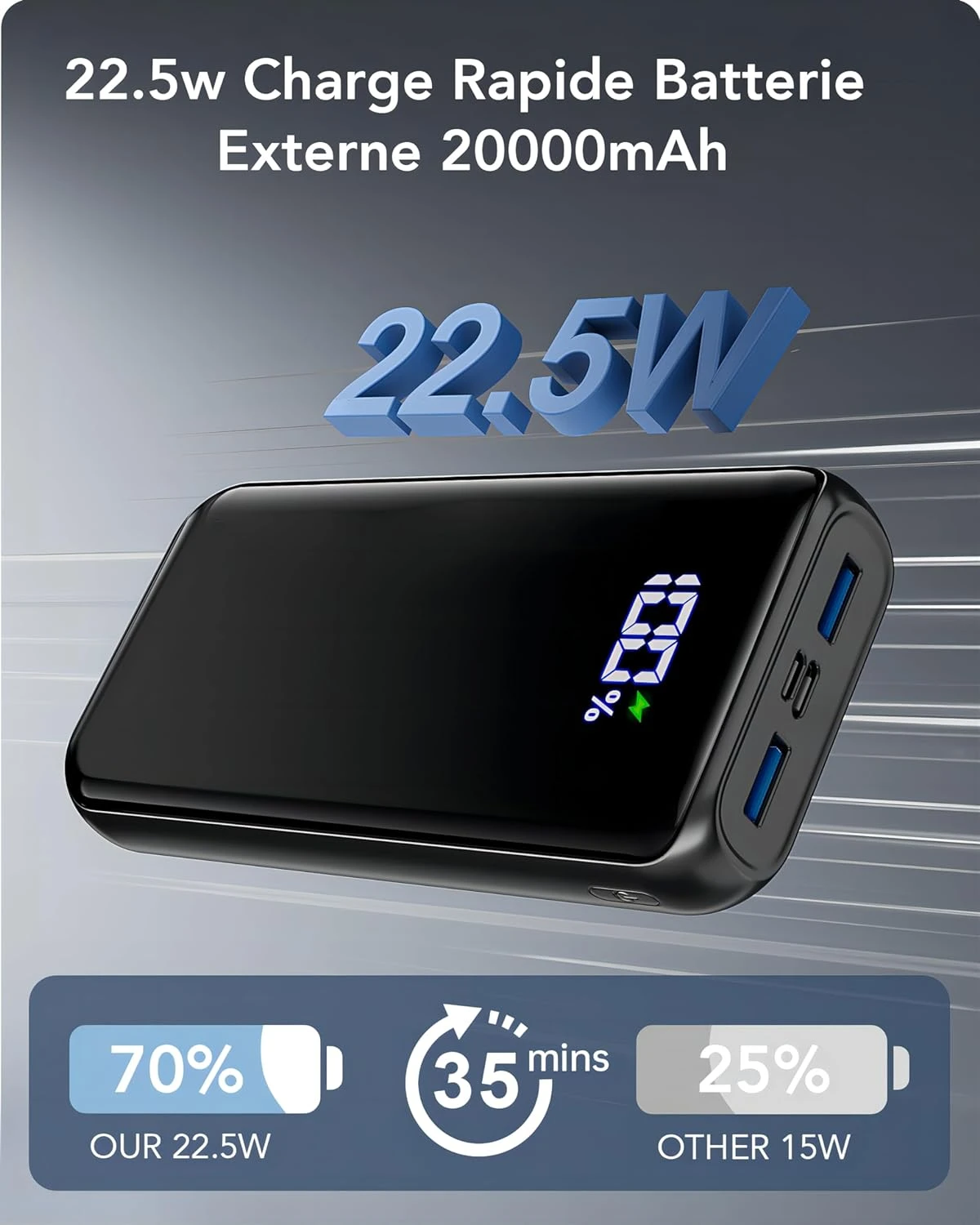 Charge Rapide à 75% en 35 Minutes : ⚡ Grâce à la technologie de charge rapide PD 3.0 et QC 4.0, cette batterie externe peut charger votre téléphone à 75% en seulement 35 minutes. Les entrées et sorties USB-C s’adaptent parfaitement aux appareils Samsung, Huawei, iPhone, iPad et bien d’autres, offrant une solution de charge ultra-rapide et fiable.