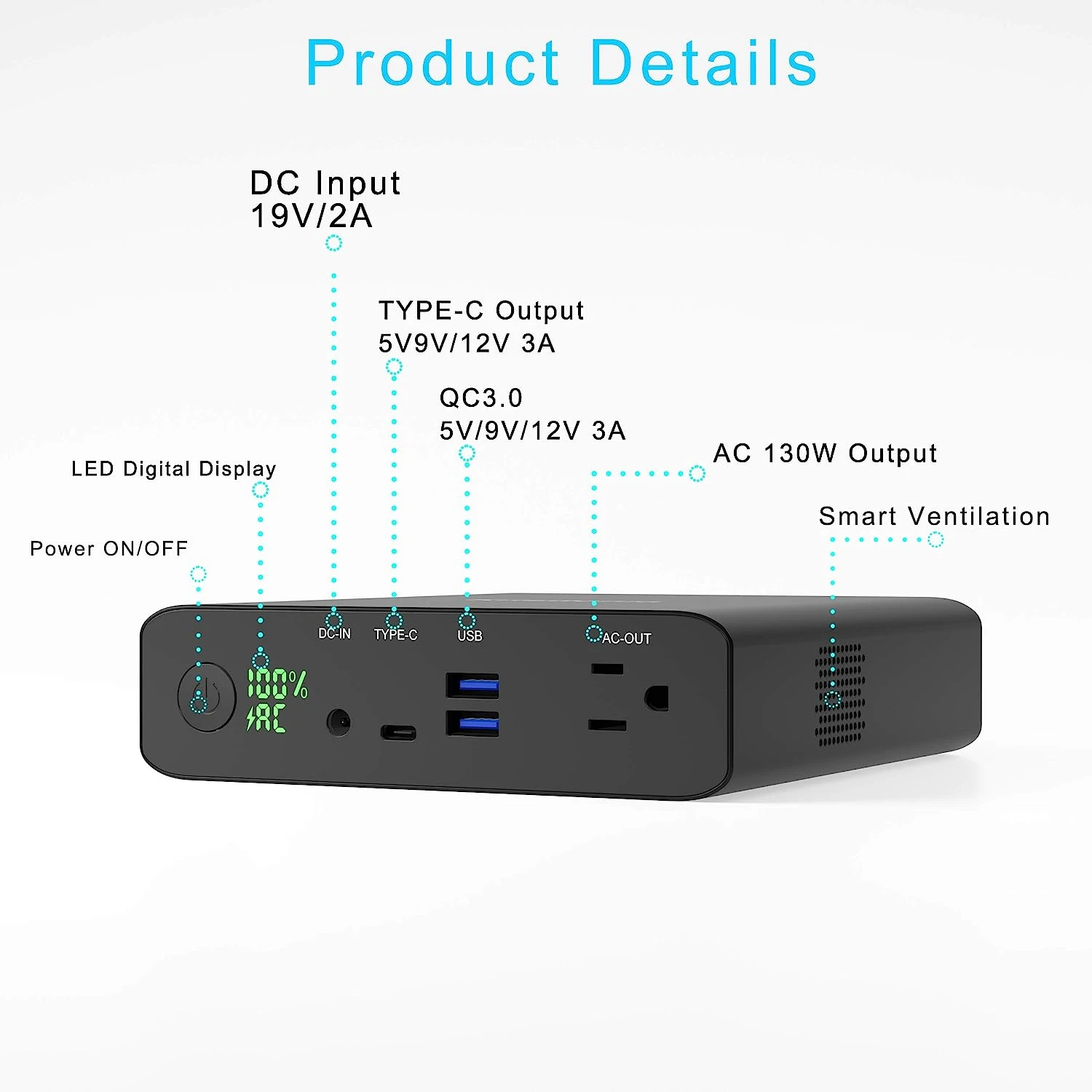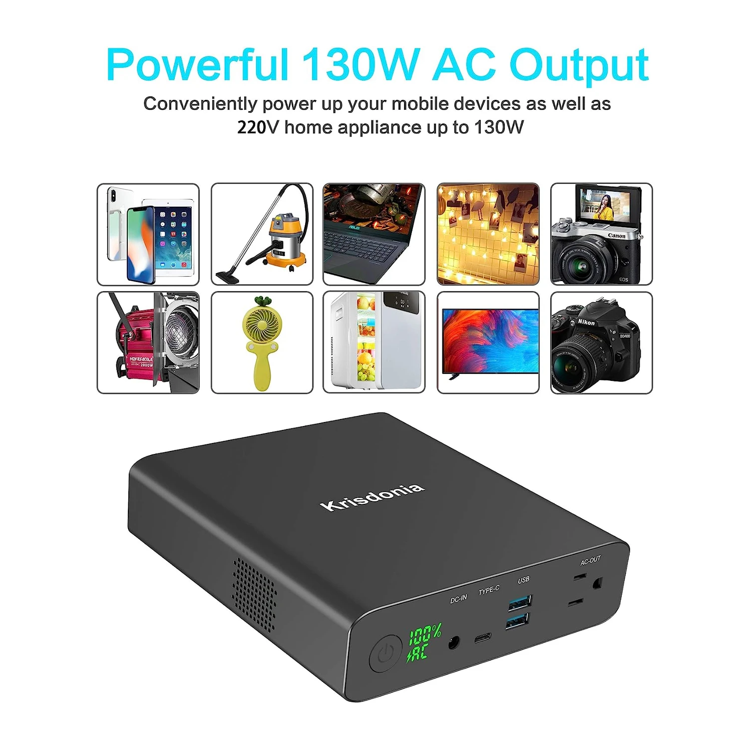 Un atout majeur de notre chargeur portable est sa prise secteur AC 220V / 130W (max). Cette fonctionnalité ingénieuse offre une solution pratique pour les appareils nécessitant une alimentation en courant alternatif. Qu’il s’agisse d’ordinateurs portables, de téléphones, de téléviseurs, d’imprimantes, de ventilateurs, de lampes, de pompes pour voitures, de grille-pains, de cafetières ou même de mini-réfrigérateurs, notre batterie externe est prête à répondre à vos besoins énergétiques (inférieurs à 130W).