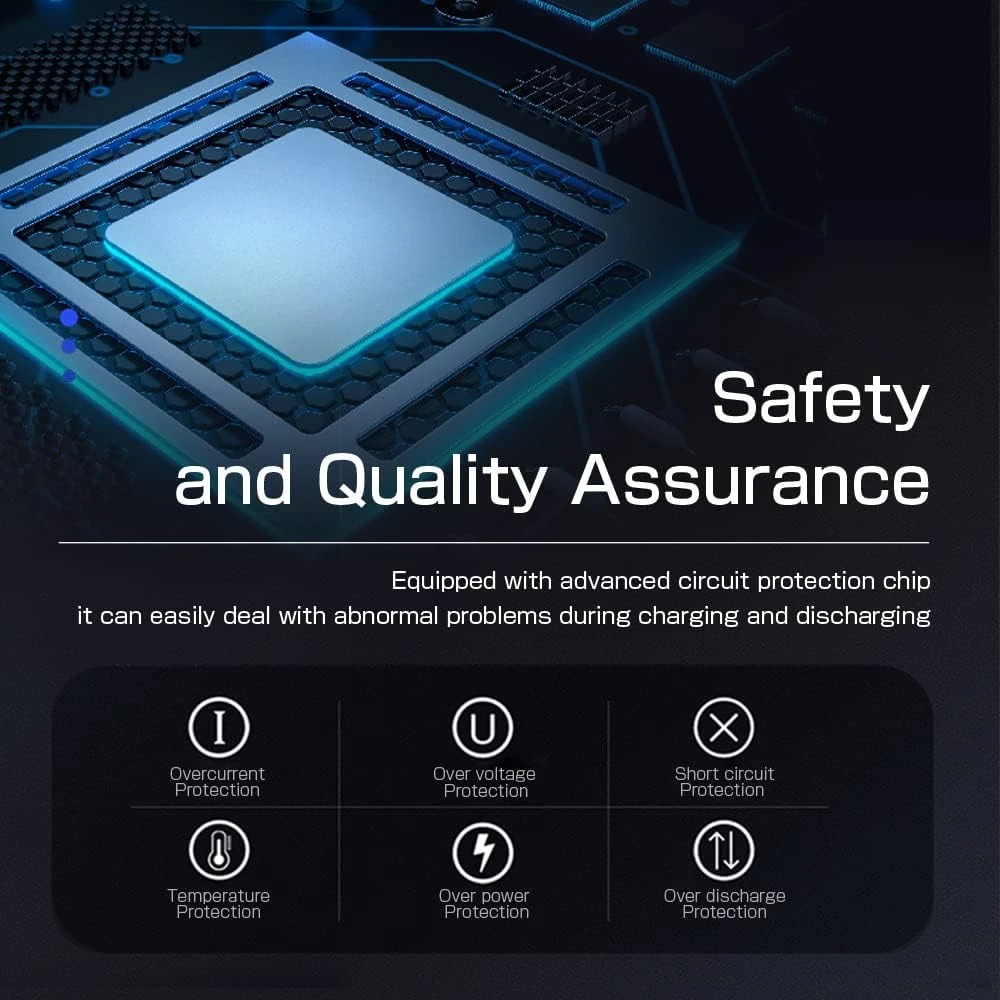 La sécurité est primordiale pour nous. Nous utilisons des puces intelligentes et des batteries au lithium polymère de haute qualité pour garantir une utilisation en toute sécurité. Notre batterie externe est équipée de protections avancées contre les courts-circuits, les décharges, les surcharges, la surintensité, la température et d’autres situations potentiellement risquées.