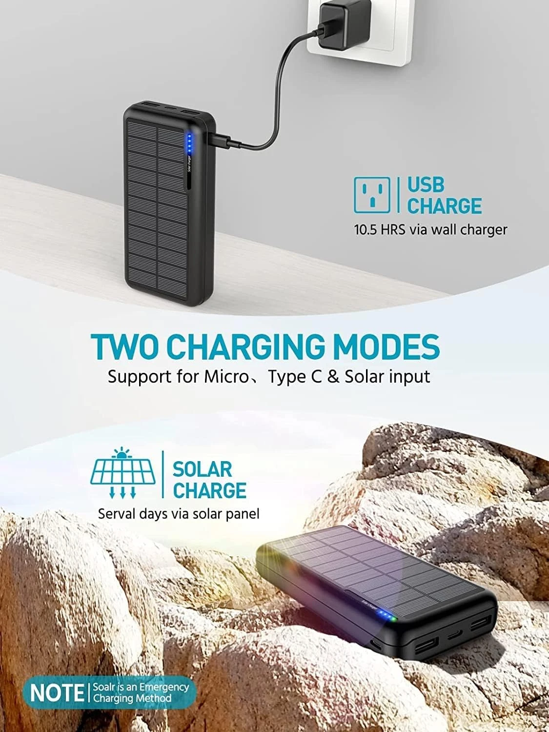 Charge Solaire D’Appoint: La batterie dispose également d’un panneau solaire de 1,5 W, vous offrant une source d’alimentation de secours lors de vos expéditions en plein air, en cas d’urgence ou dans des conditions météorologiques défavorables. Toutefois, veillez à charger complètement la batterie externe avant votre voyage, car le chargement solaire est une caractéristique supplémentaire pour garantir votre tranquillité d’esprit.
