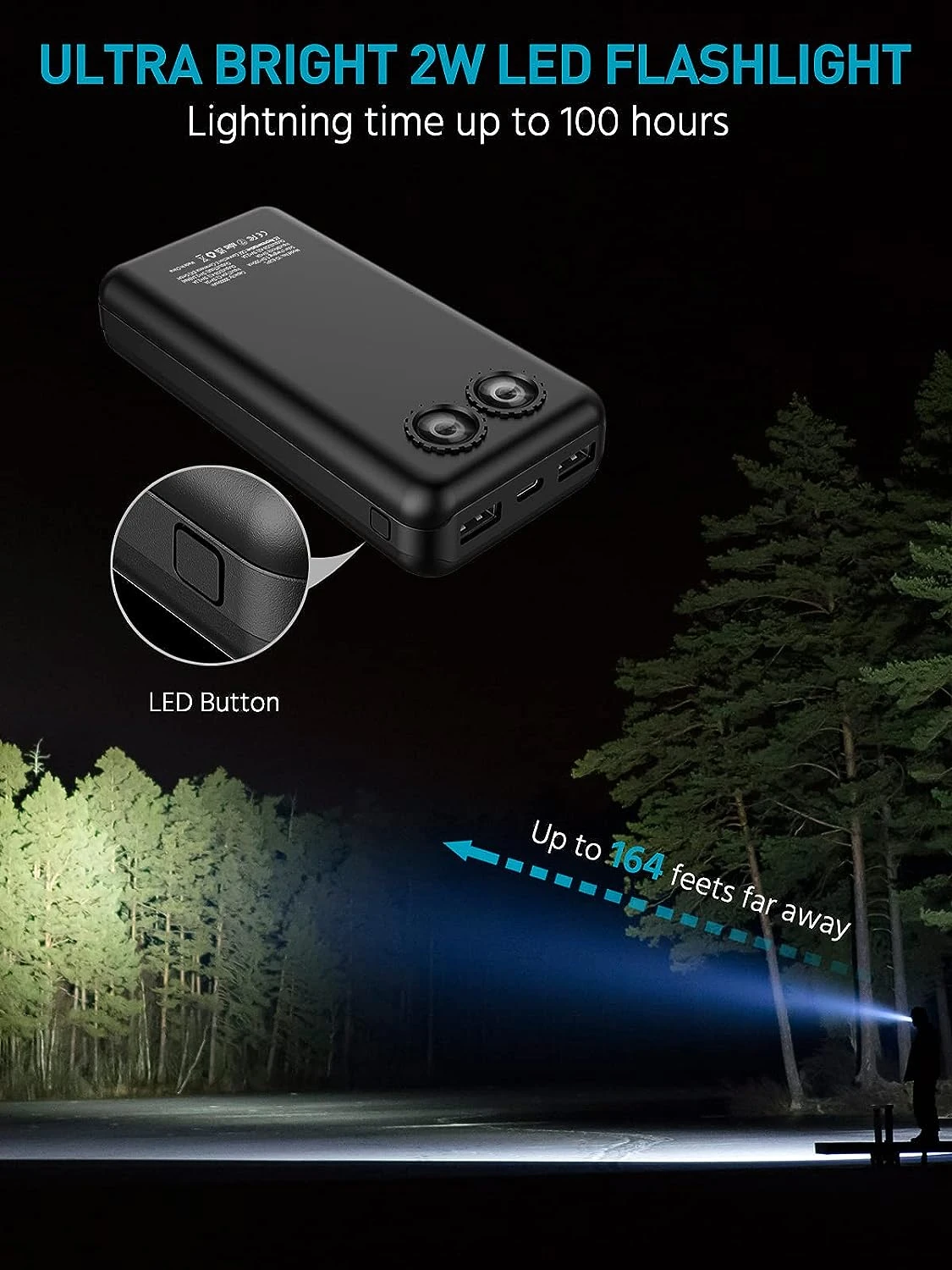 Double Sortie USB et Éclairage LED: La batterie Powerbank dispose de deux sorties USB intégrées, chacune fournissant un courant de 5 V/2,1 A. Cela signifie que vous pouvez charger simultanément deux appareils, ce qui en fait l’accessoire idéal pour rester connecté, que ce soit avec votre téléphone, votre tablette ou d’autres appareils. De plus, elle est équipée de deux lampes de poche LED puissantes avec un mode d’éclairage en lumière douce, vous assurant une source de lumière fiable en extérieur et en cas d’urgence.