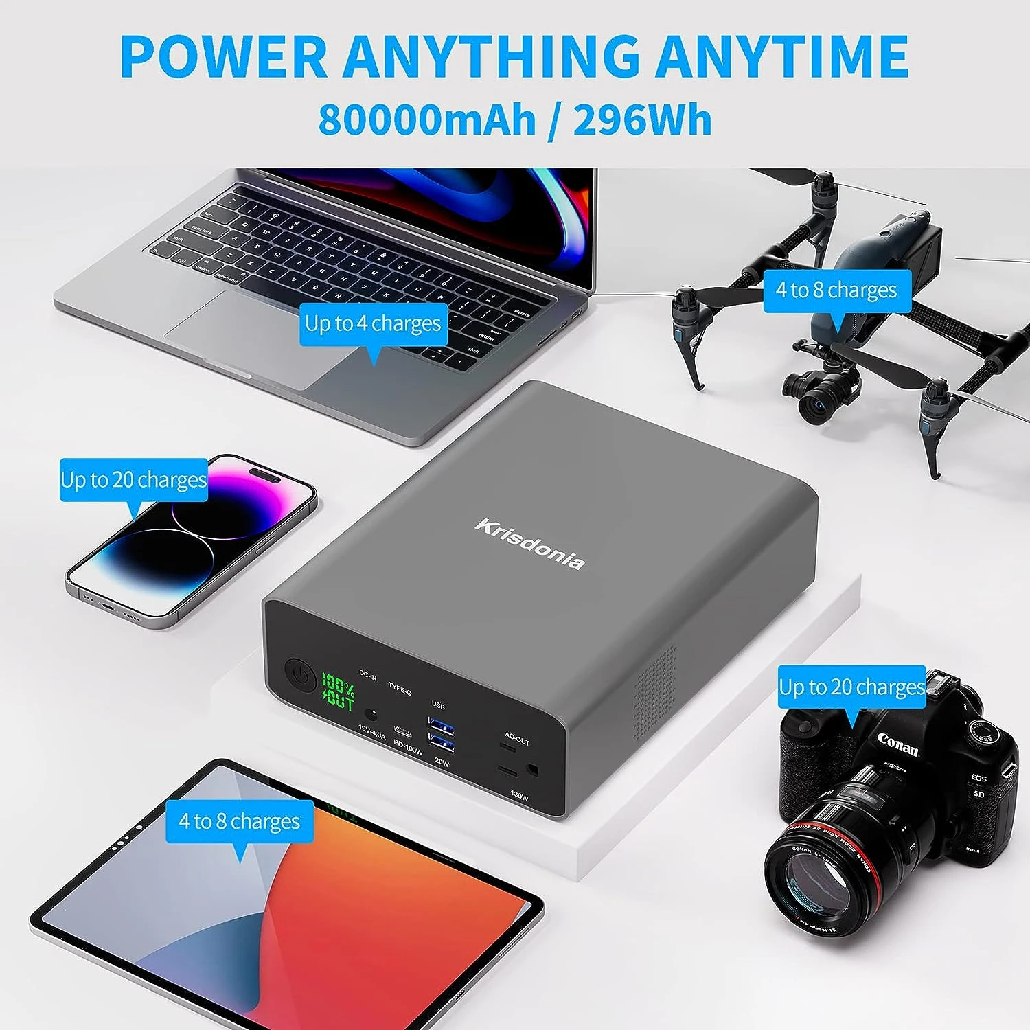 Avec une capacité impressionnante de 80000mAh, notre batterie externe peut alimenter un MacBook Pro 16 pouces deux fois, un DJI Mavic Mini 11 à 12 fois et un iPhone 14 Pro Max 13 à 14 fois. Ne soyez jamais à court d’énergie, même lors de longs voyages ou de journées chargées.