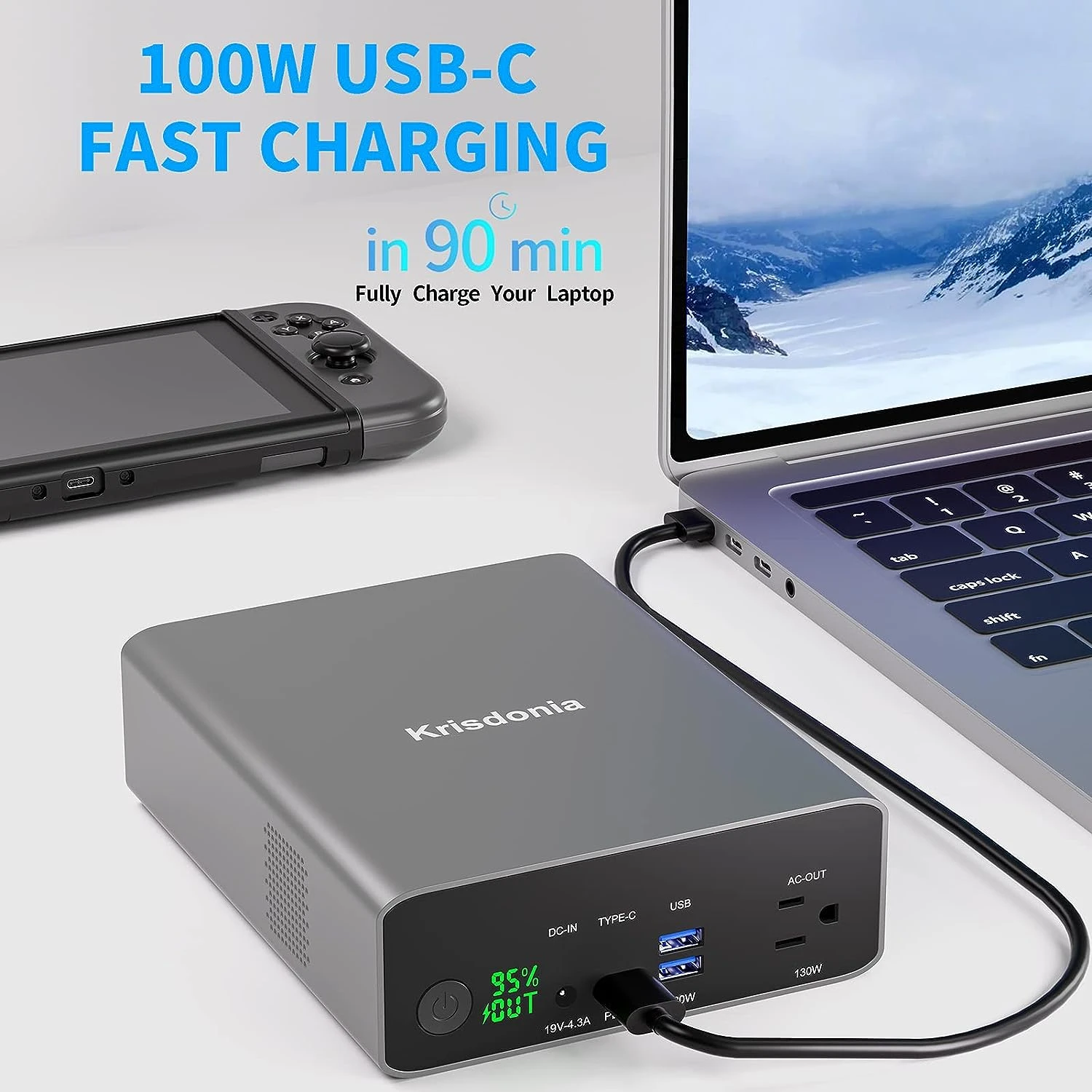 La fonction de chargement simultané est une caractéristique clé de notre Batterie Externe PC Portable. Grâce à une prise secteur de 130 Watts, un port USB-C de 100W et 2 ports USB supplémentaires, vous pouvez désormais charger jusqu’à 4 appareils en même temps. Plus besoin de prioriser les appareils à charger, vous pouvez garder tous vos appareils opérationnels en même temps.