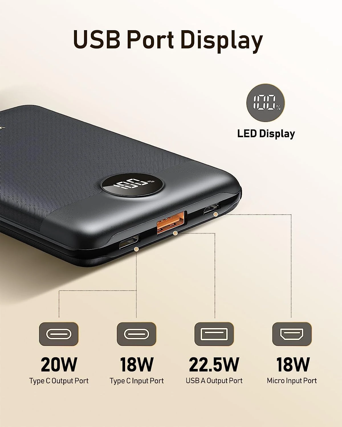 L’écran LED intégré à notre batterie portable affiche avec précision le pourcentage d’énergie restante, de 0% à 100%. Cela vous permet de suivre en temps réel le niveau de la batterie, vous offrant une visibilité claire sur la durée d’utilisation restante. En choisissant notre Batterie Externe Petite Et Puissante, vous optez pour une solution de charge pratique et performante, conçue pour s’adapter à votre style de vie actif et connecté ✅.