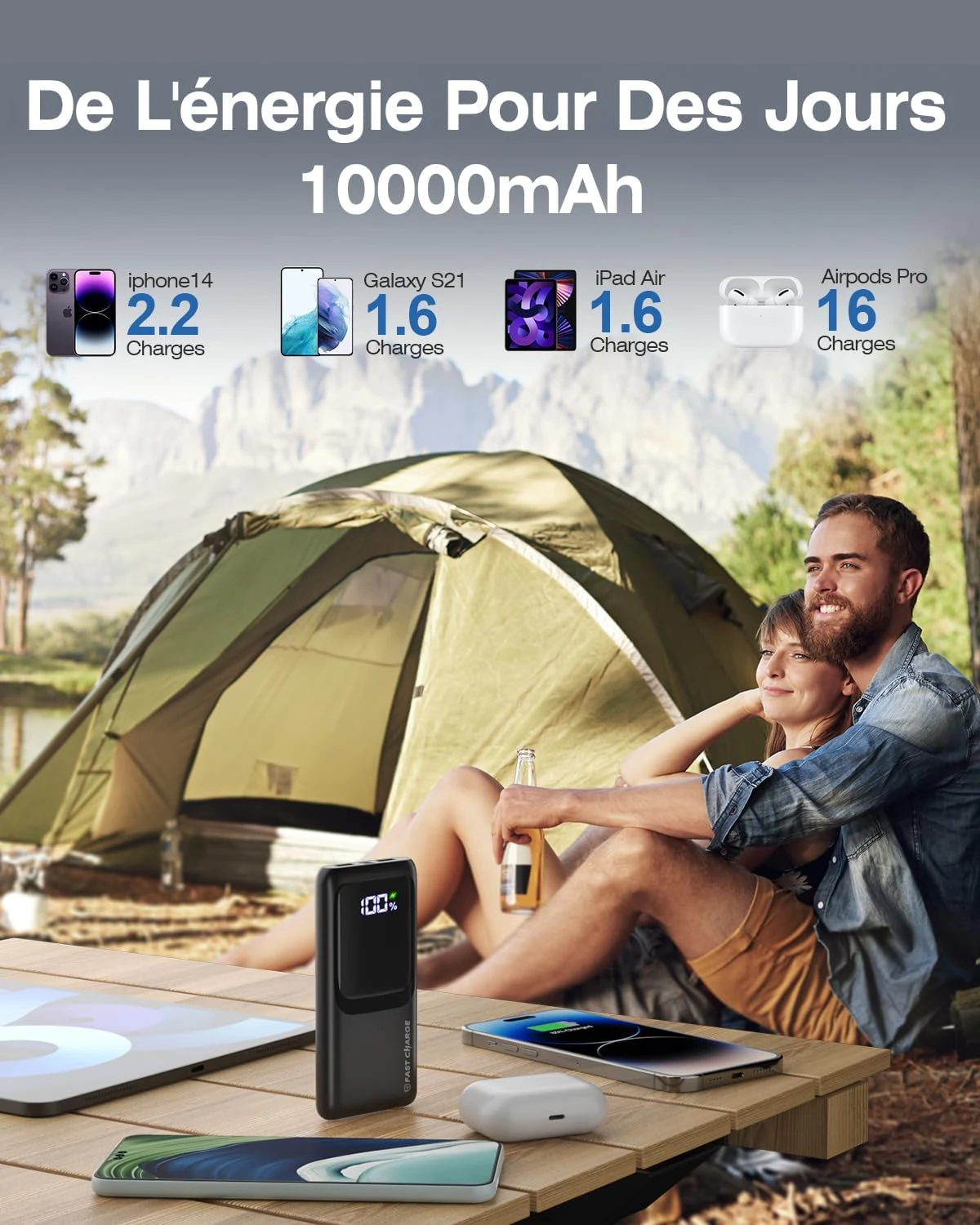Avec une épaisseur de seulement 1,8 cm et un poids plume de 224g, cette batterie est l’une des plus minces du marché. Elle se glisse facilement dans votre poche ou votre sac, idéale pour les journées bien remplies, les voyages ou le camping.