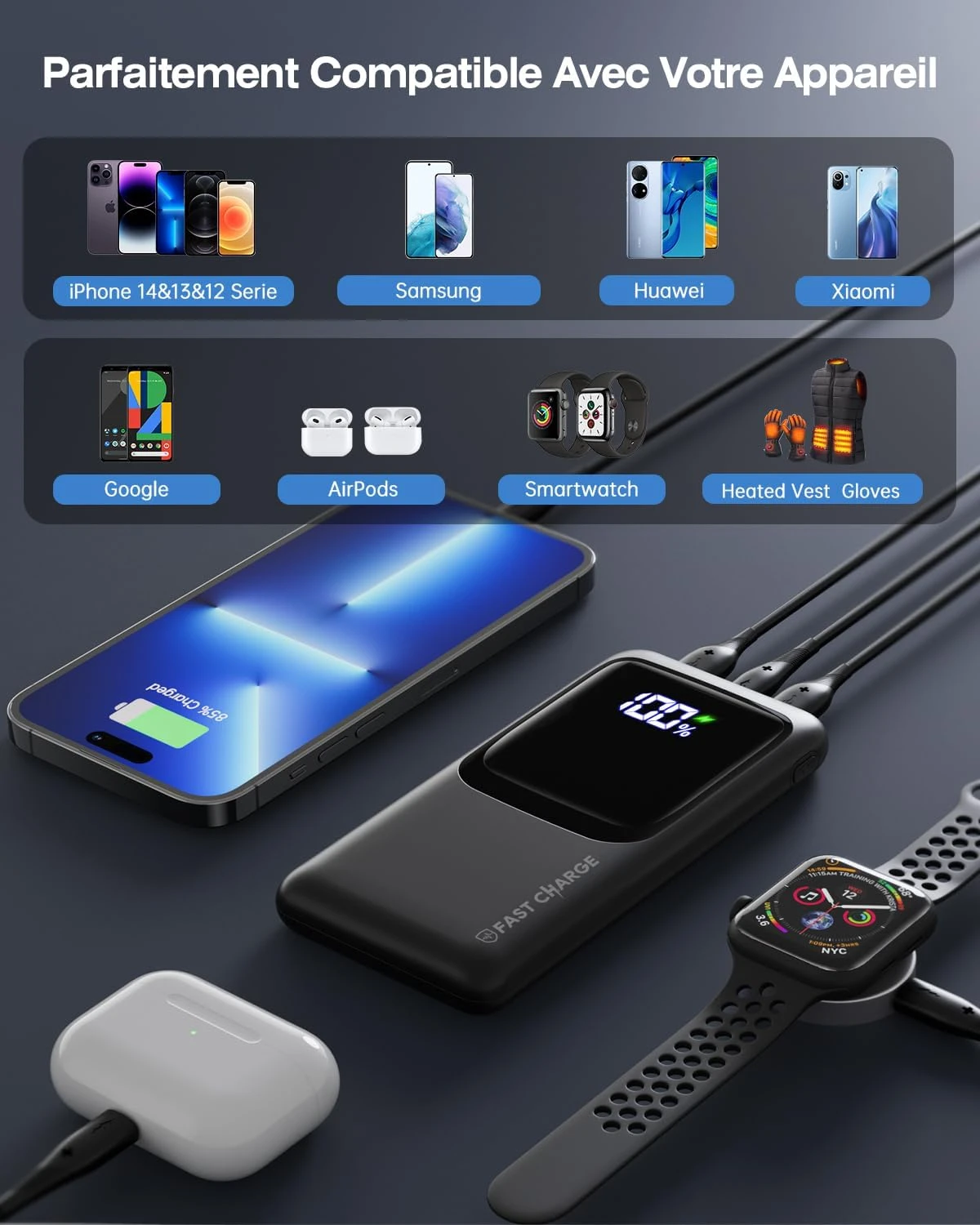 Compatible avec tous vos appareils : smartphones, tablettes, casques Bluetooth, montres connectées et autres petits gadgets. Cette batterie externe est polyvalente et s’adapte à tous vos besoins numériques.