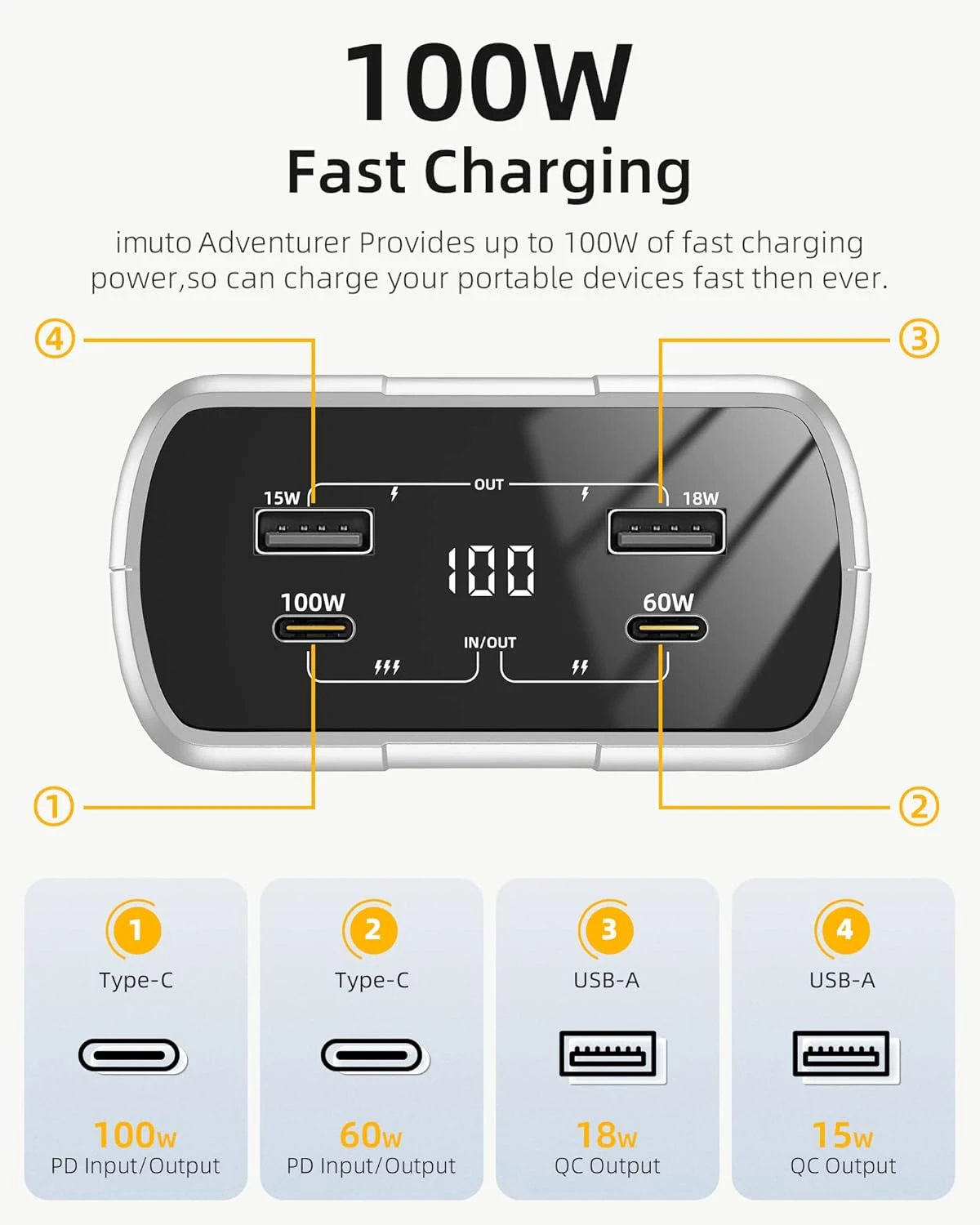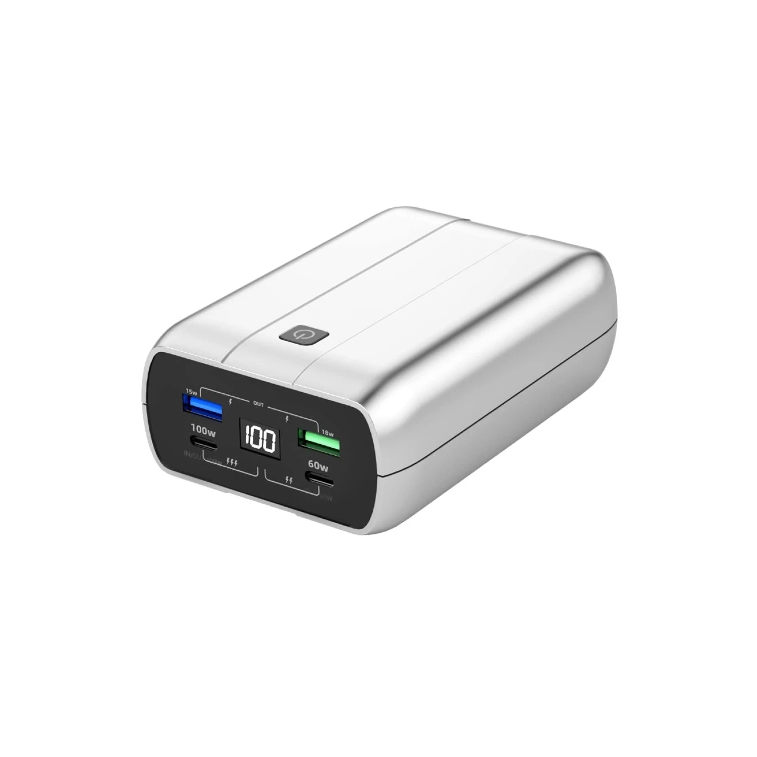Notre batterie dispose de 4 ports intelligents : 2 USB-C et 2 USB-A, vous permettant de recharger simultanément jusqu’à quatre appareils, y compris smartphones, tablettes, ordinateurs portables et même caméras. Une solution idéale pour partager la puissance entre vos différents appareils ou avec vos proches.