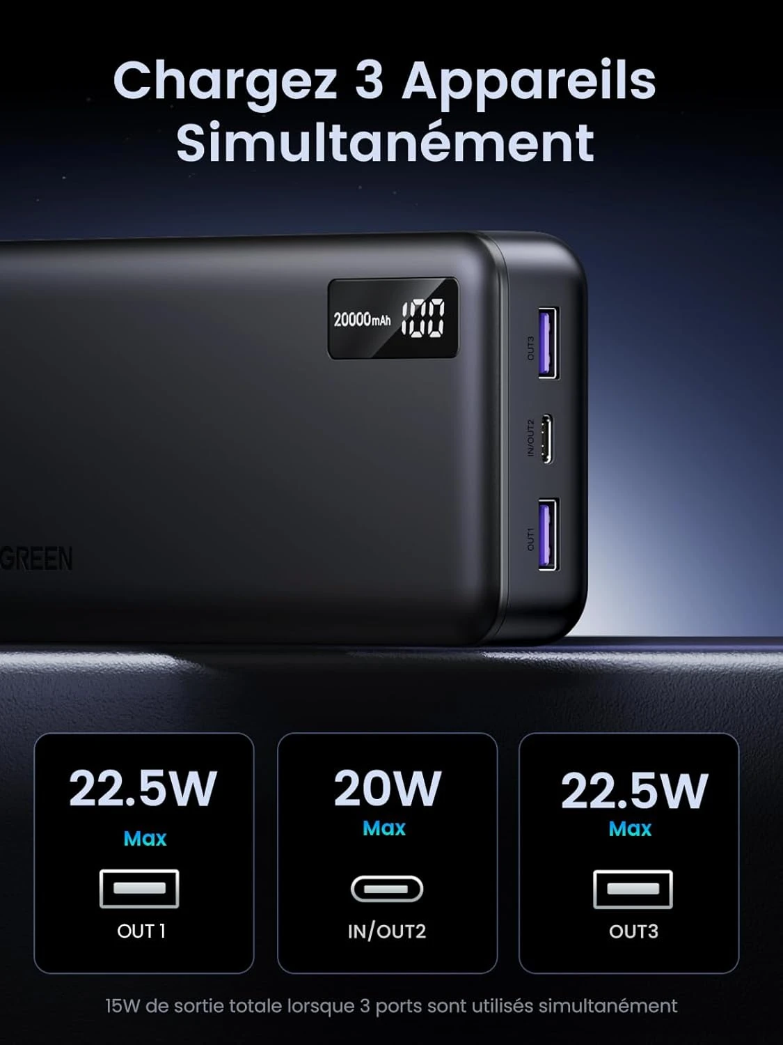 ⚡ Charge Rapide et Simultanée Notre batterie externe propose trois sorties rapides (1 USB-C et 2 USB-A) avec une puissance de charge de 5V/3A pour des performances optimales. Rechargez simultanément votre téléphone, tablette et écouteurs ou partagez l’énergie avec vos amis pour un gain de temps précieux.