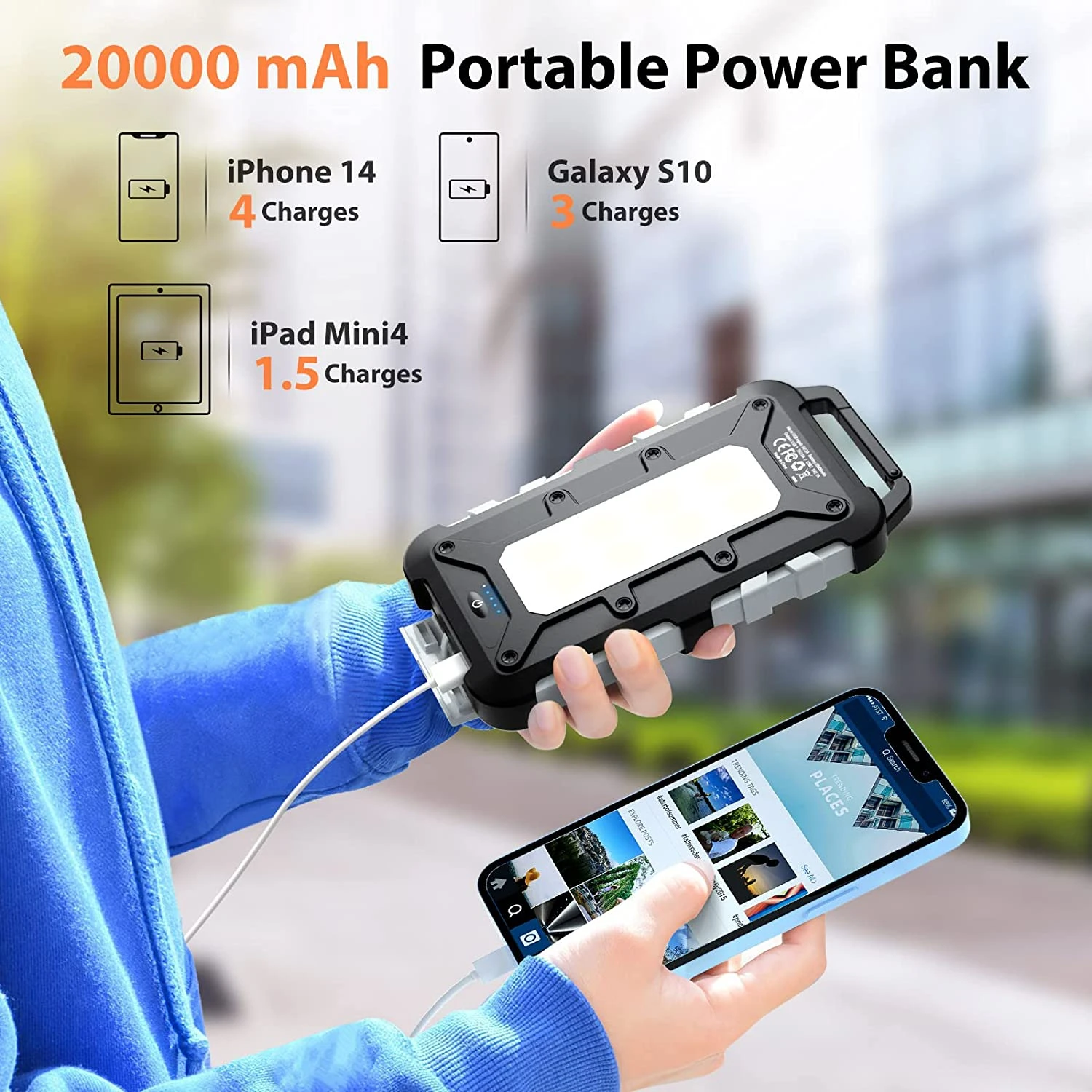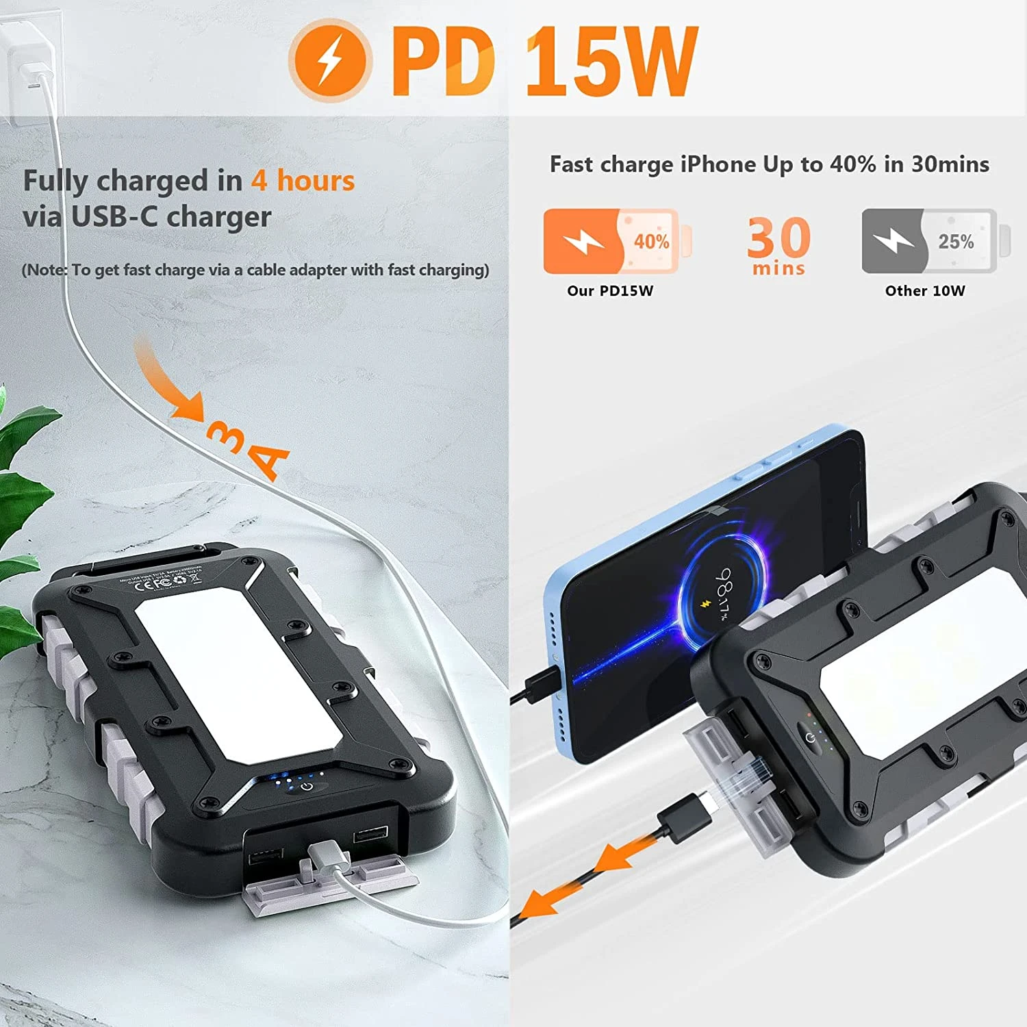Elle peut recharger vite les appareils, jusqu’à 3 en filaire et dispose d’une lampe de poche 💕. Elle a une grande capacité de 20000mAh lui permettant de fournir 2 à 3 charges facilement sans être rechargée.