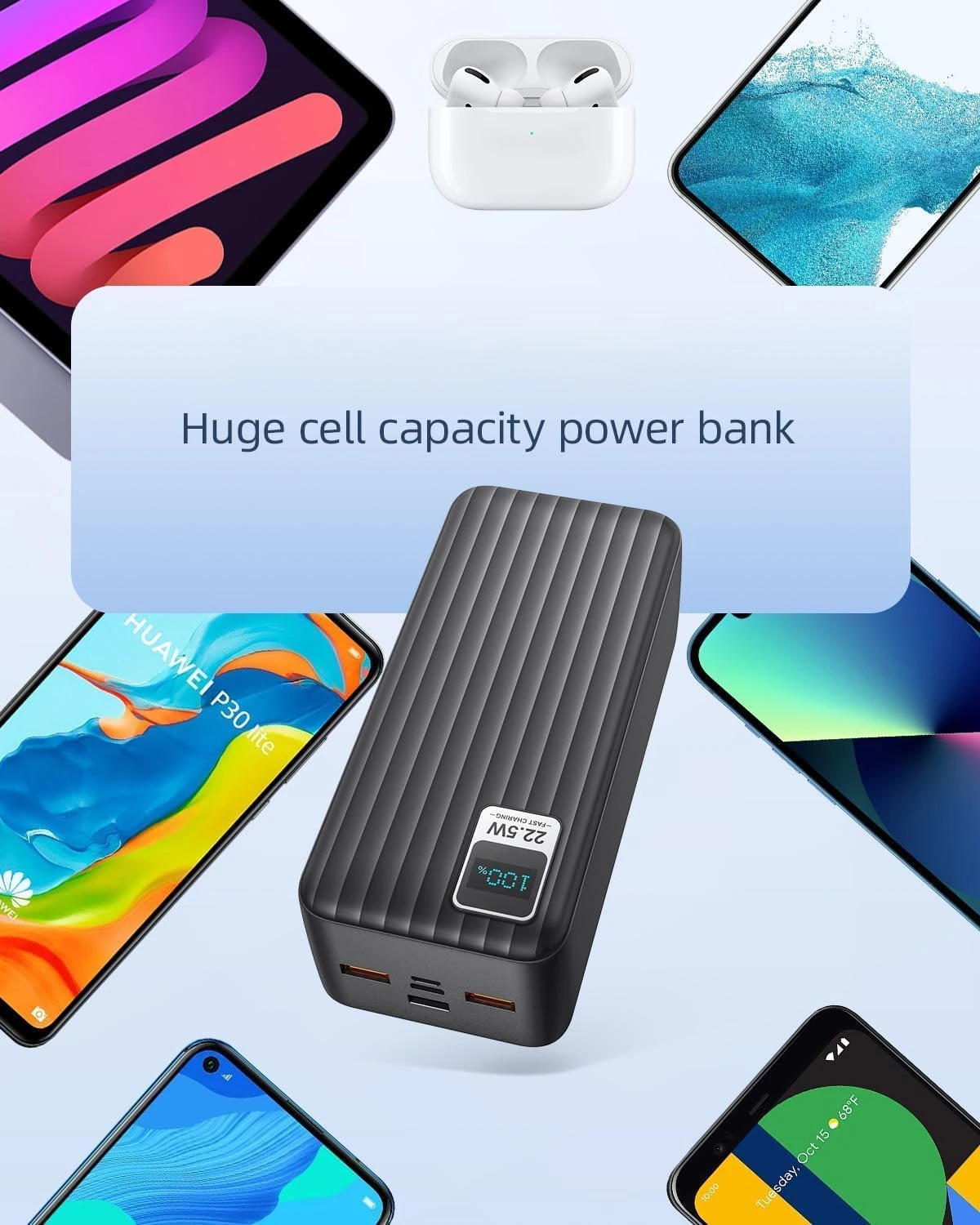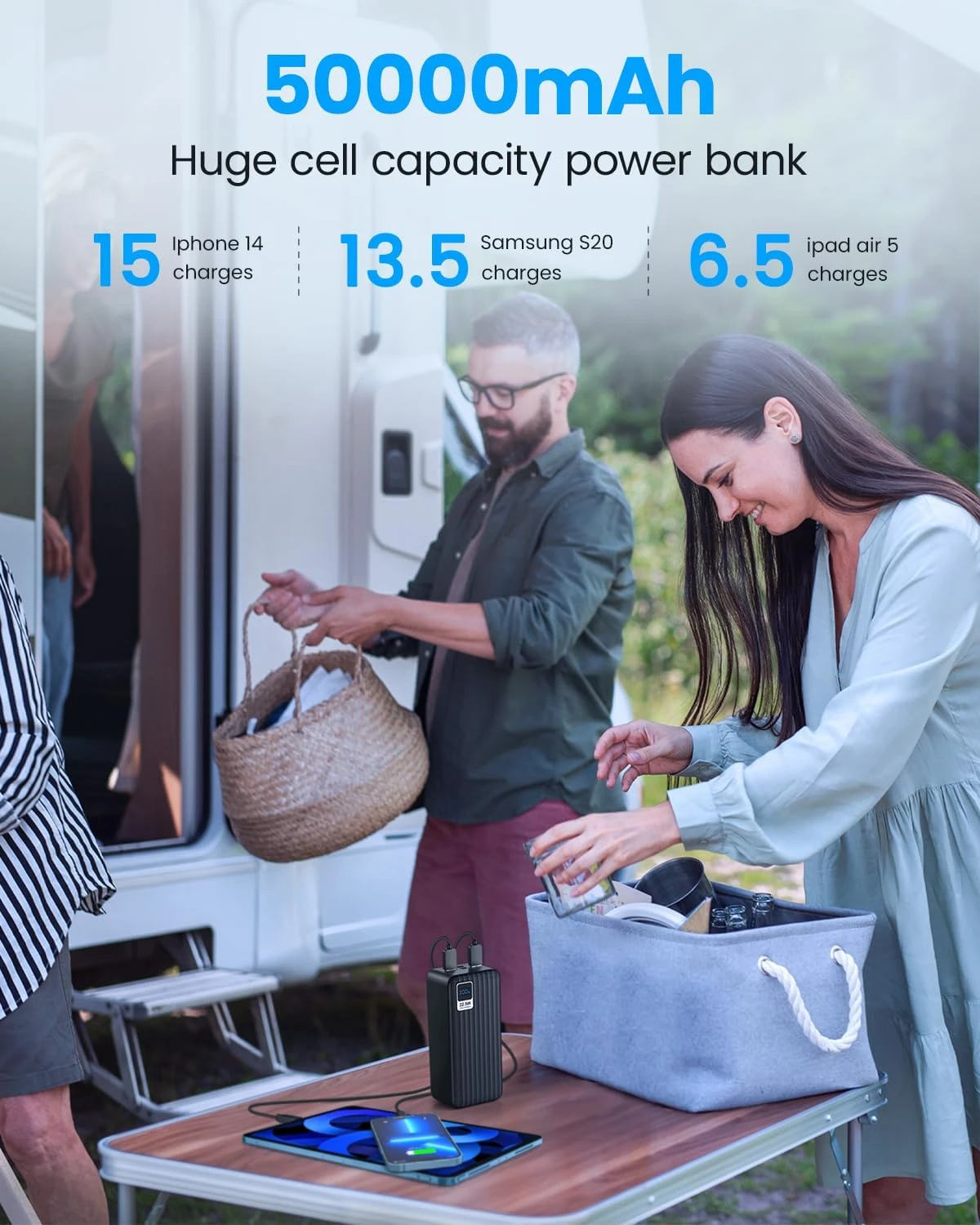 👉 Chargeur Portable à Grande Capacité : Notre powerbank offre une capacité immense de 50000mAh, vous permettant de recharger votre iPhone 12 jusqu’à 15 fois et d’ajouter 50 heures d’autonomie à votre iPad Air. Compacte et équipée d’une nouvelle batterie polymère haute densité, cette centrale d’énergie mobile vous libère des prises fixes, idéale pour vos déplacements.