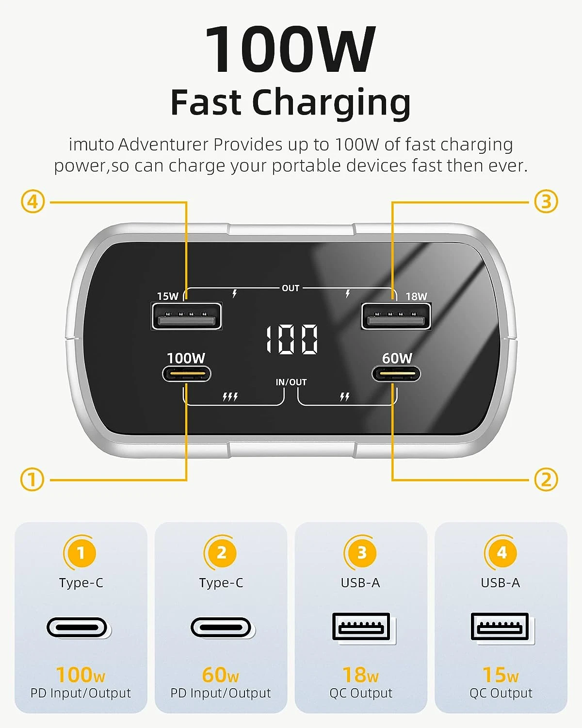 Malgré sa capacité énorme, notre chargeur portable reste compact. Avec des dimensions de 11,6 x 8,7 x 4,2 cm, il se glisse facilement dans votre sac, en faisant le compagnon de voyage idéal pour vos aventures, que ce soit pour le travail ou les loisirs 💖. Vous n’aurez plus à choisir quels appareils charger en premier. Notre batterie externe est équipée de 2 ports USB-C compatibles PD et 2 ports USB-A, vous permettant de charger jusqu’à 4 appareils simultanément. Que ce soit des ordinateurs portables, des tablettes, des appareils photo ou des smartphones, notre batterie externe est prête à les alimenter rapidement.