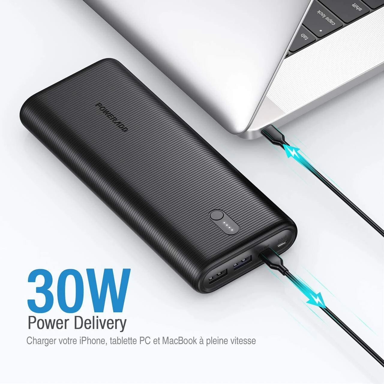 Envie d’une batterie externe avec un port USB C pour votre ordinateur portable ? Découvrez vite notre modèle atteignant une vitesse de charge de 30W combiné à la technologie Power Delivery. Sa capacité énorme lui permet de recharger un très grand nombre de fois un smartphone ou encore 4.5 fois un MacBook 12 Inch.