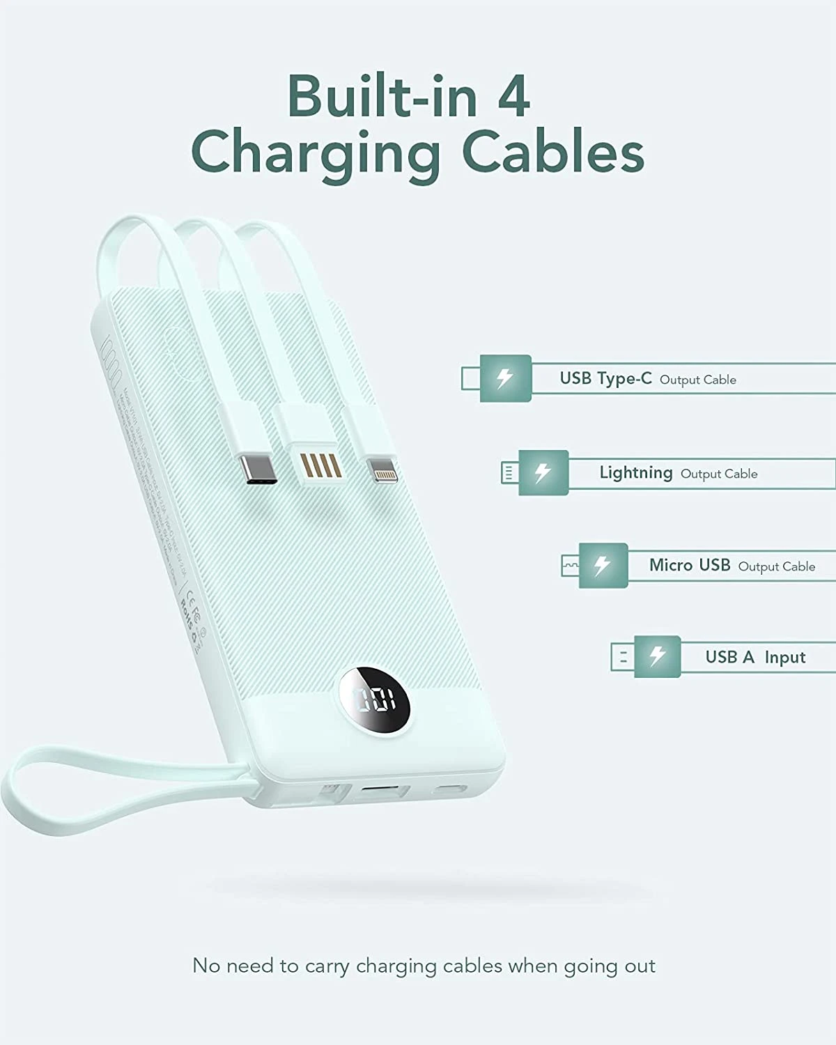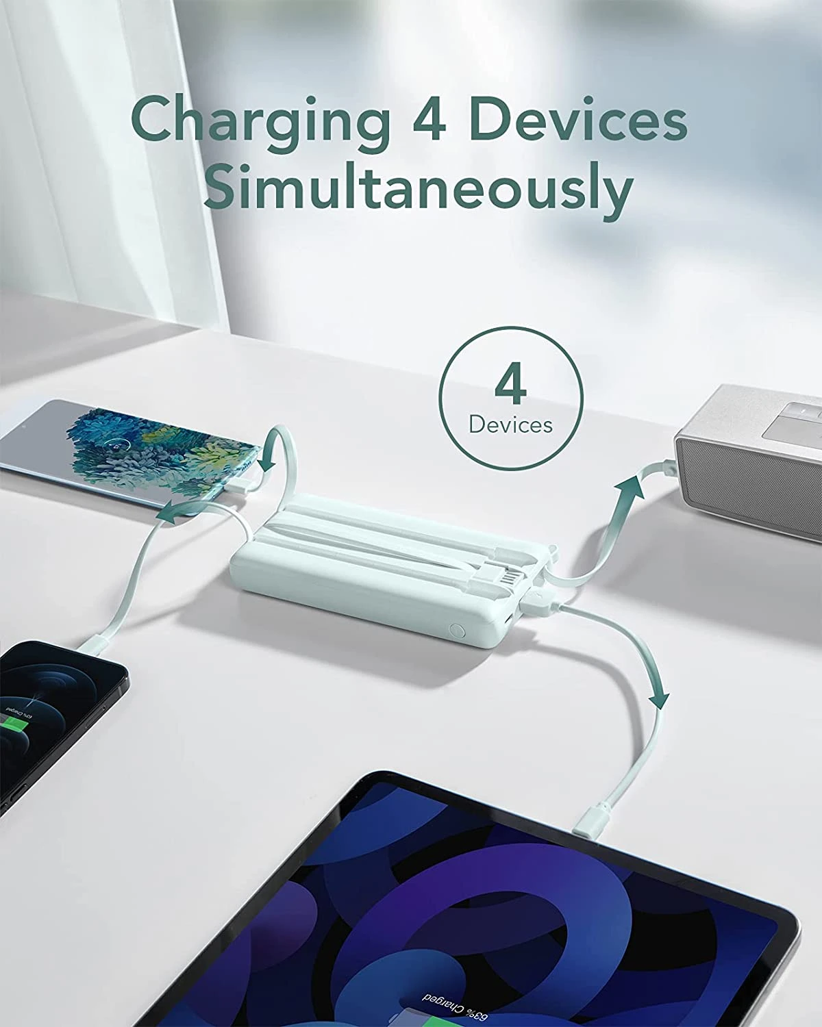 Notre Batterie Externe de 10000 mAh VEEKTOMX dispose de 4 câbles intégrés permettant de recharger 4 appareils simultanément. L’intégration des câbles au sein de la Power Bank est très utile et permet de ne pas les perdre et de ne pas oublier de les prendre ❤️.