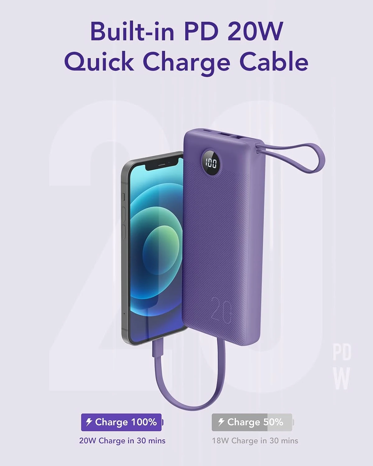 Profitez d’une technologie de charge rapide avancée : la sortie USB atteint 22,5W, tandis que les câbles intégrés prennent en charge jusqu’à 18W pour le type C et 20W pour les appareils compatibles iPhone. Votre téléphone peut ainsi atteindre 60% en seulement 30 minutes, optimisant votre temps et votre productivité.