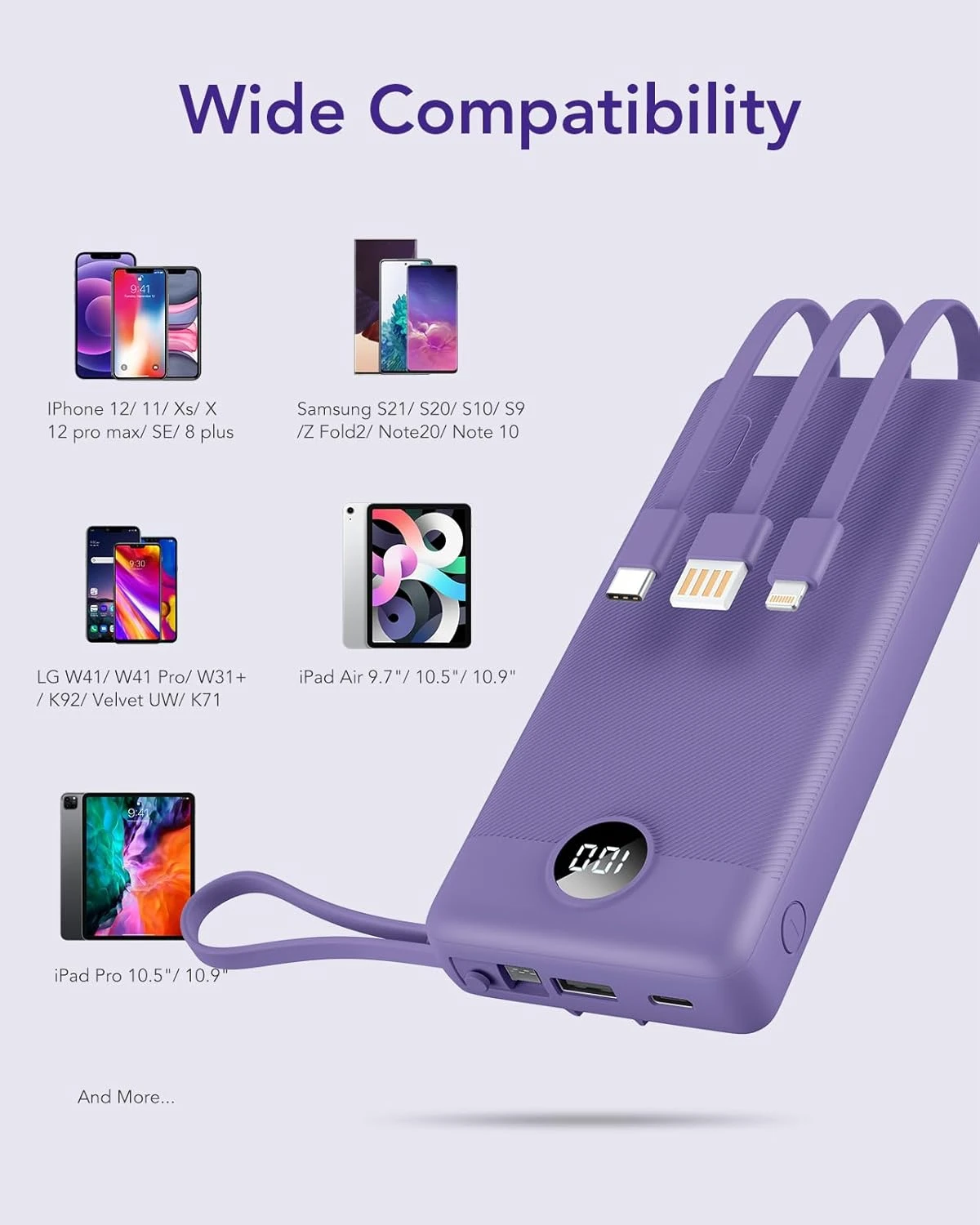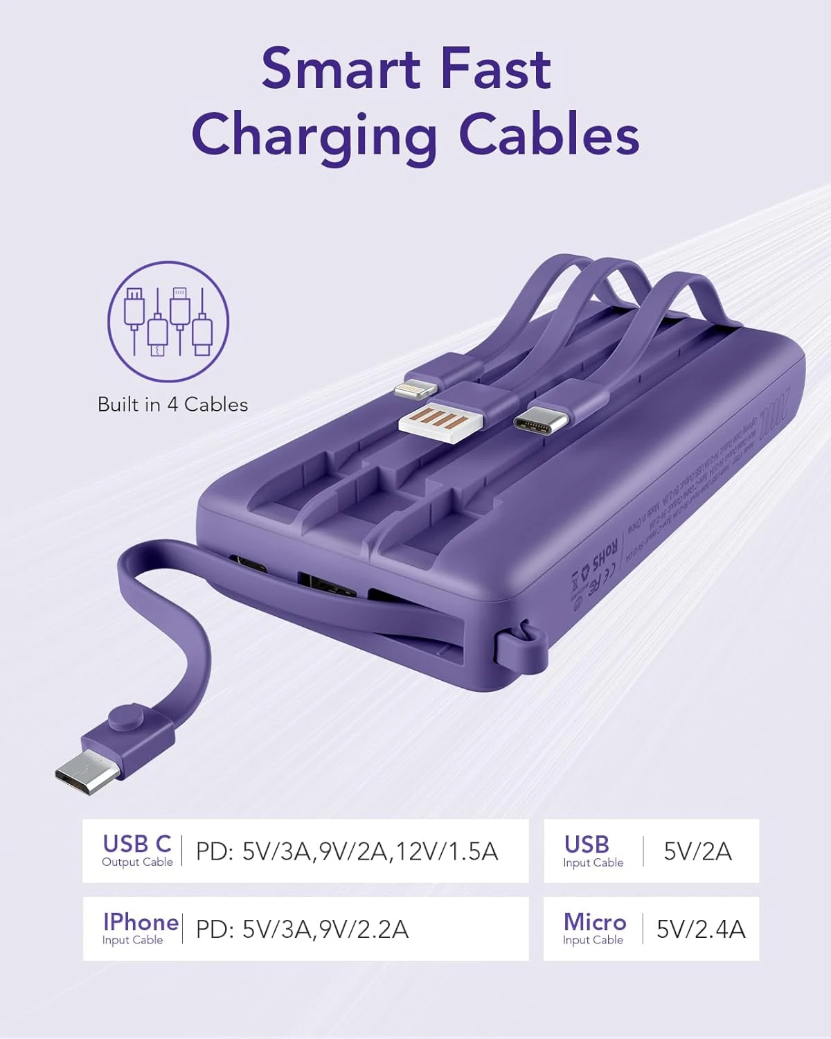 Notre batterie externe violette est équipée de quatre câbles intégrés, offrant une compatibilité impressionnante avec des connecteurs USB-C, USB-A et micro-USB. Grâce à cette conception, chargez jusqu’à quatre appareils simultanément, qu’il s’agisse de téléphones, tablettes ou autres dispositifs électroniques. Précision importante : cette batterie n’est pas compatible avec la série Google Pixel.