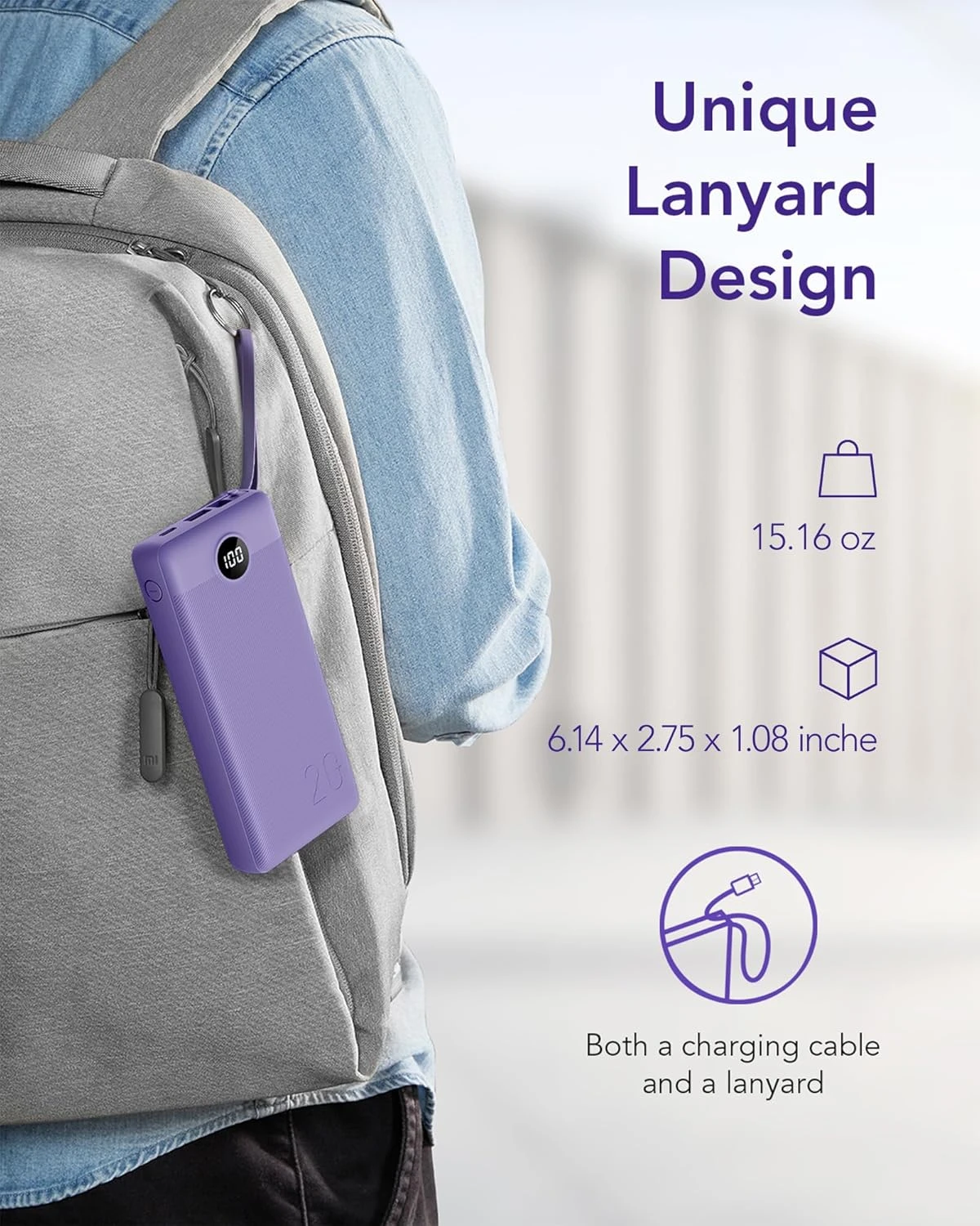 Son design élégant et fonctionnel inclut un câble micro-USB intégré, qui peut également servir de cordon pour faciliter le transport. L’écran LCD clair indique précisément la charge restante, vous tenant informé à chaque instant. Compacte et portable, elle est parfaite pour un usage quotidien ou lors de vos voyages.