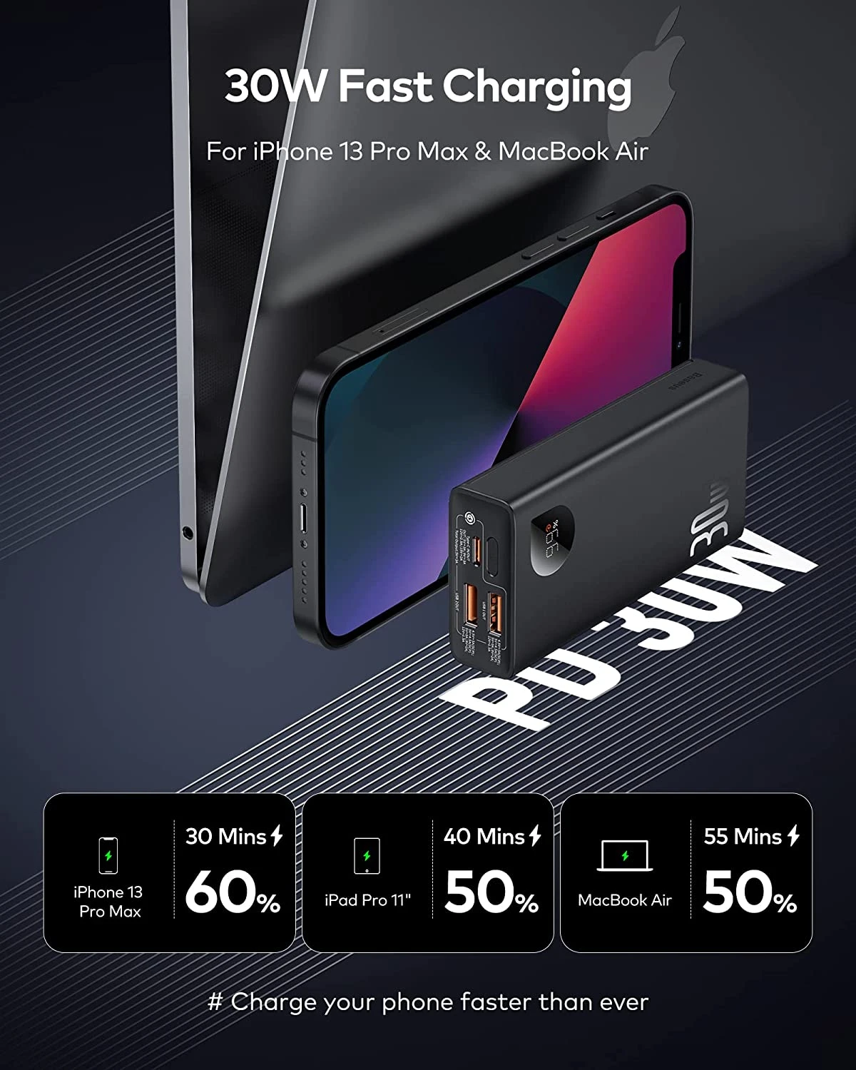 Notre Power Bank de 10000 mAh Baseus a une grande puissance de 30 watts permettant de recharger n’importe quel téléphone portable à la vitesse la plus haute possible ❤️.