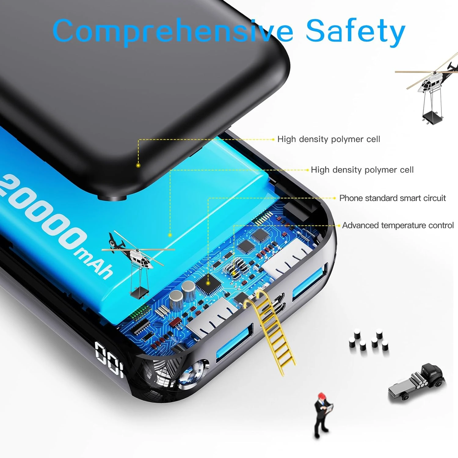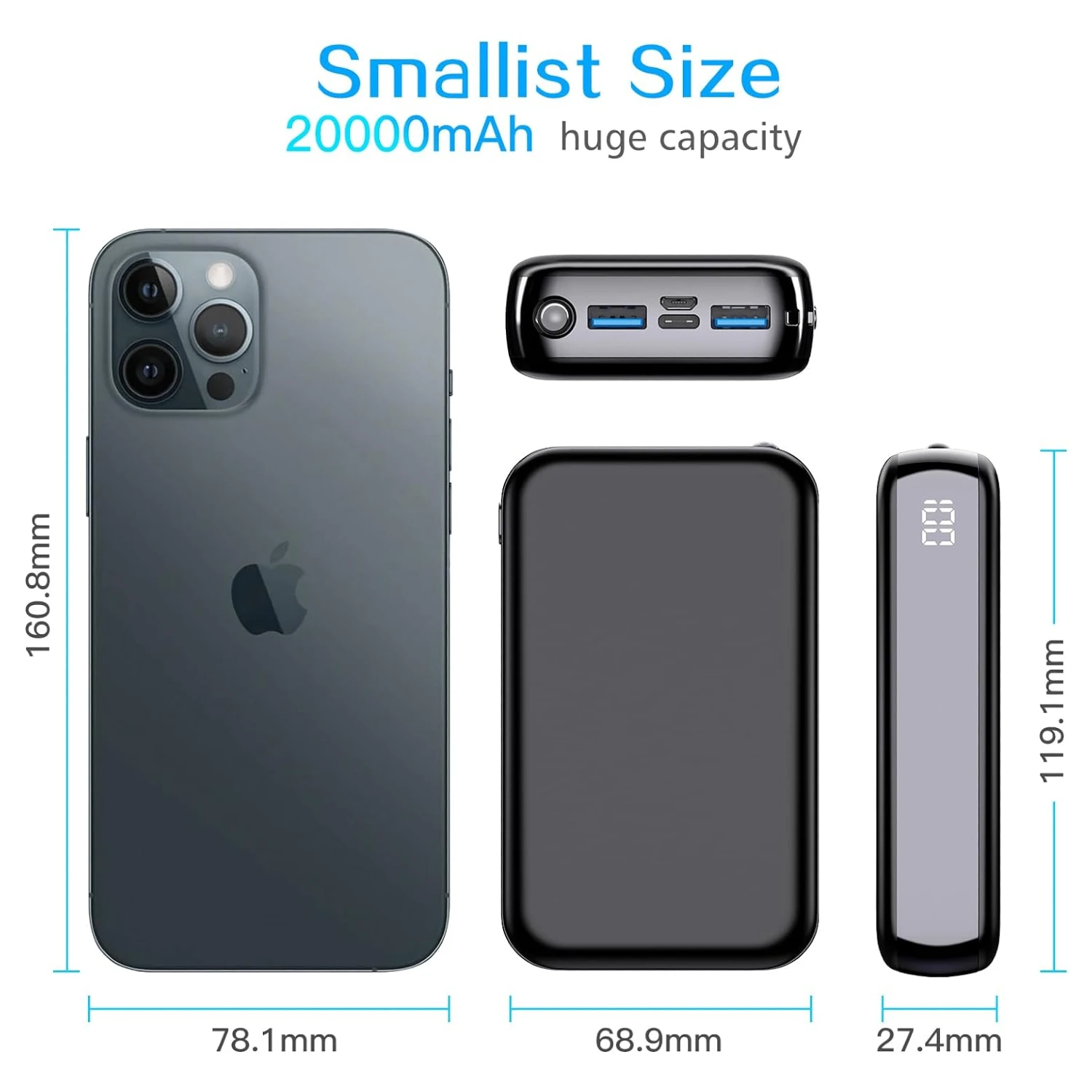Conclusion : Notre Batterie Portable 20 000 mAh combine capacité élevée, charge rapide et sécurité, le tout dans un format compact pour vous accompagner dans tous vos déplacements. Profitez de la tranquillité d’esprit en sachant que votre énergie est entre de bonnes mains. 🔋