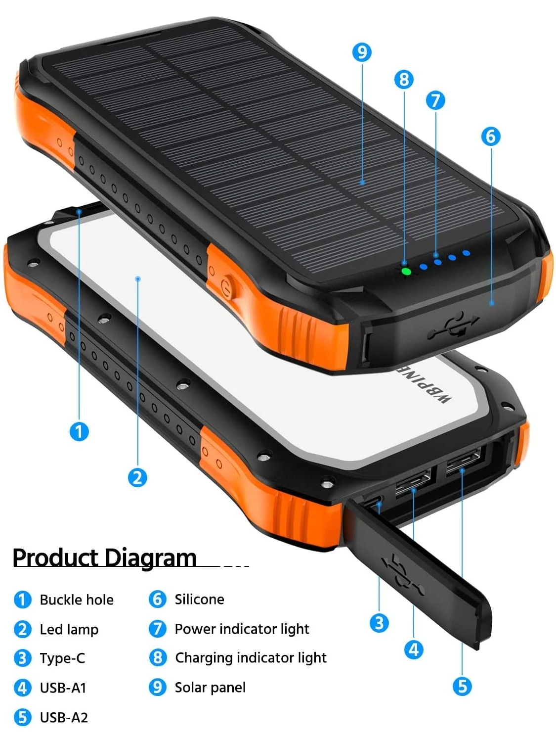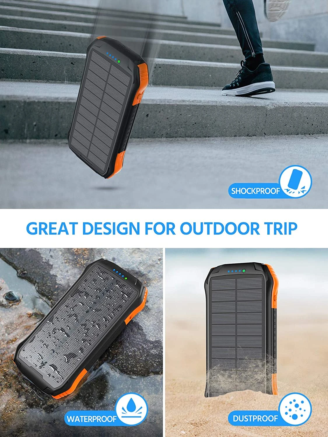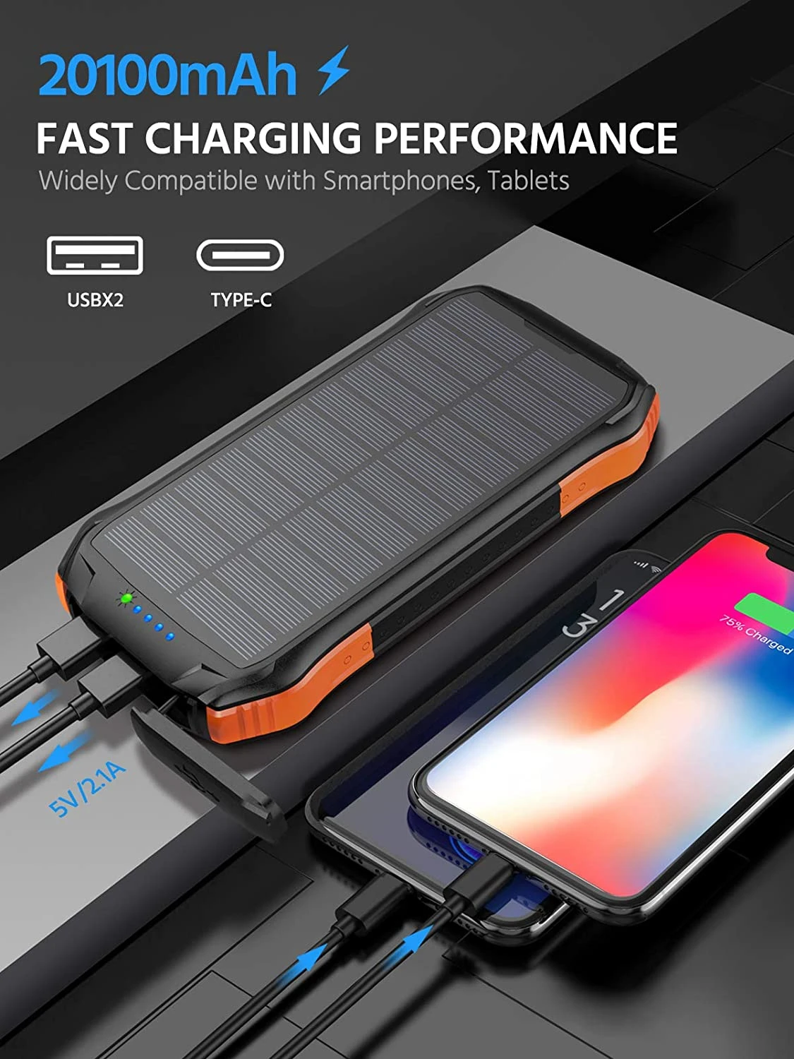 Avec une capacité impressionnante de 20 100mAh, cette batterie peut recharger votre téléphone jusqu’à 7 fois. Son panneau solaire amélioré permet une recharge 1,5 fois plus rapide à la lumière du soleil, idéale pour les longs voyages, les sorties en plein air ou les déplacements professionnels.