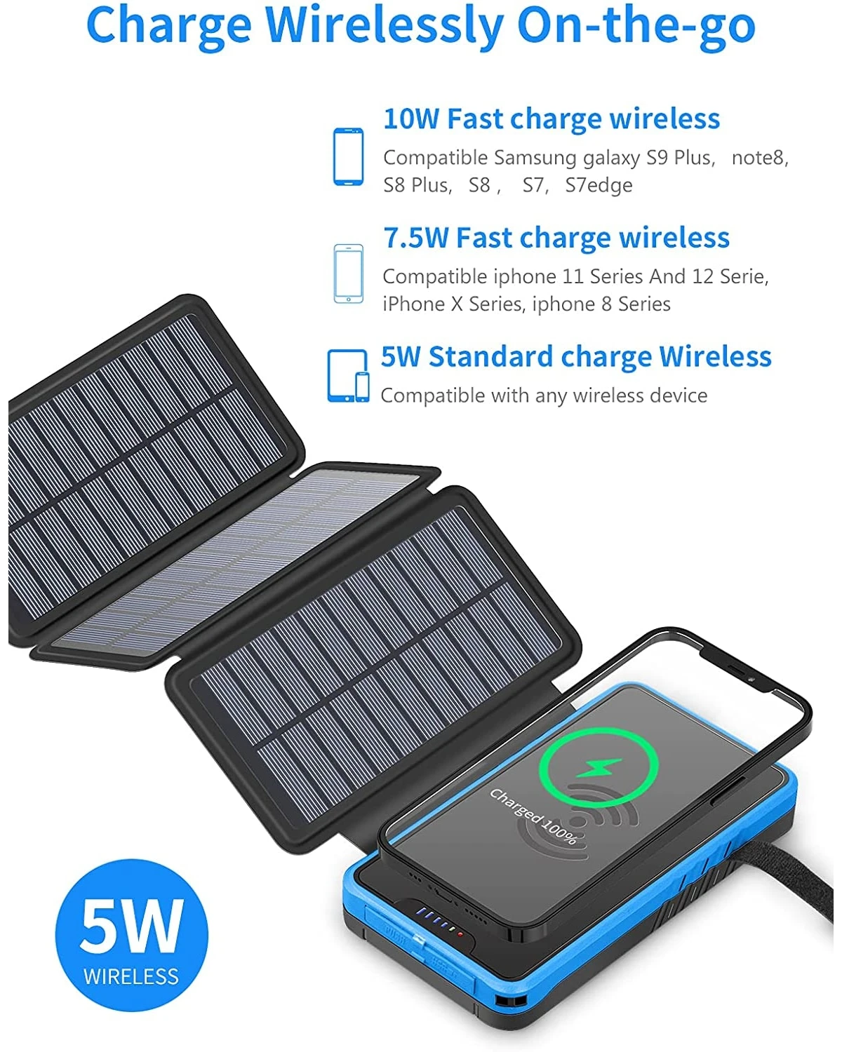 Notre Batterie Externe Solaire munie de 4 Panneaux Solaires est l’une des batteries externes solaires les plus efficientes du marché. En effet, ses 4 panneaux solaires très performant (7.5W) lui permettent de se recharger bien plus rapidement que la moyenne.