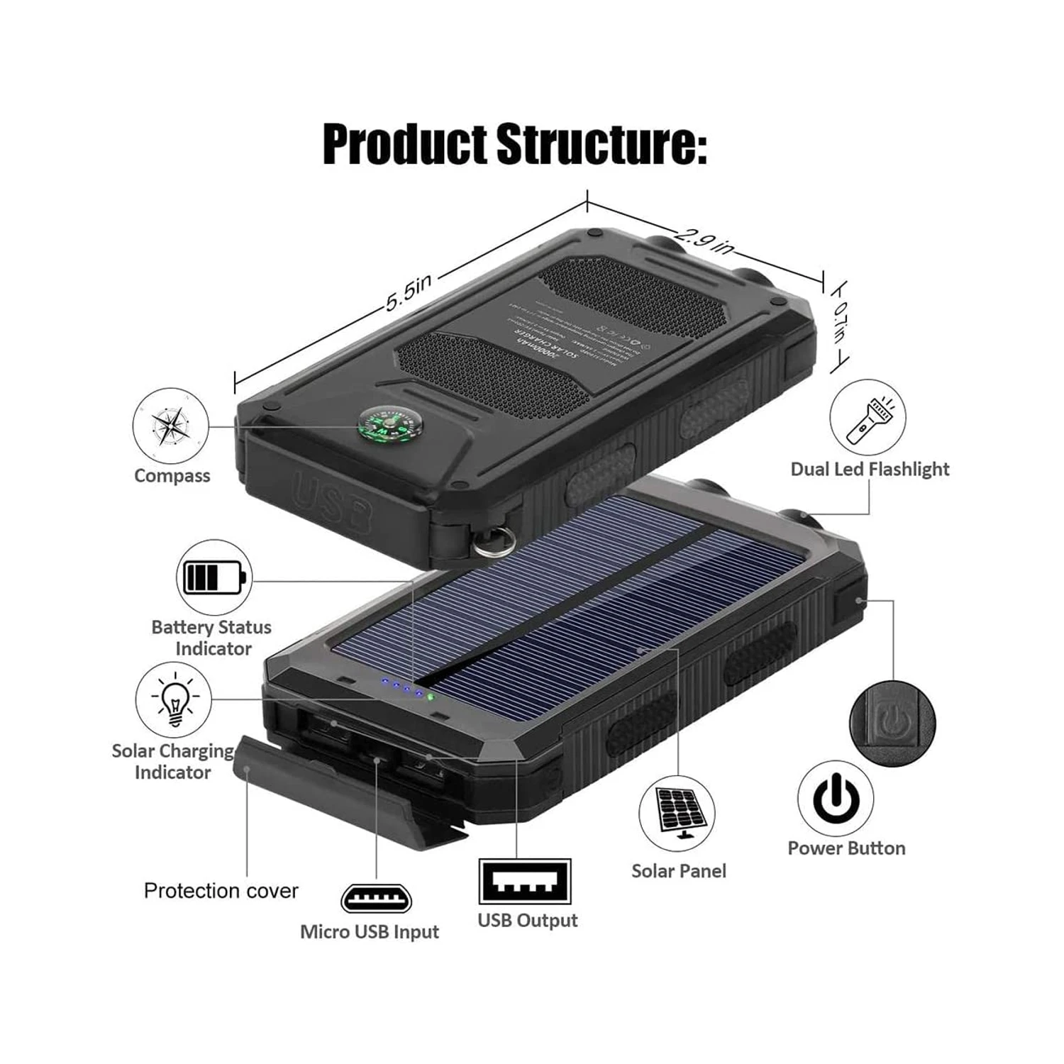 Cette batterie solaire est à la fois étanche, antichoc et antipoussière, ce qui en fait un choix parfait pour les environnements difficiles. Elle est équipée d’un mousqueton pratique et d’une boussole intégrée, ainsi que d’une lampe de poche LED avec mode stroboscopique SOS pour les situations d’urgence. Un outil polyvalent pour vos escapades en pleine nature.
