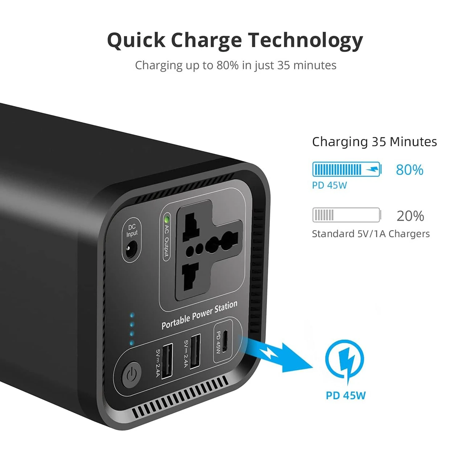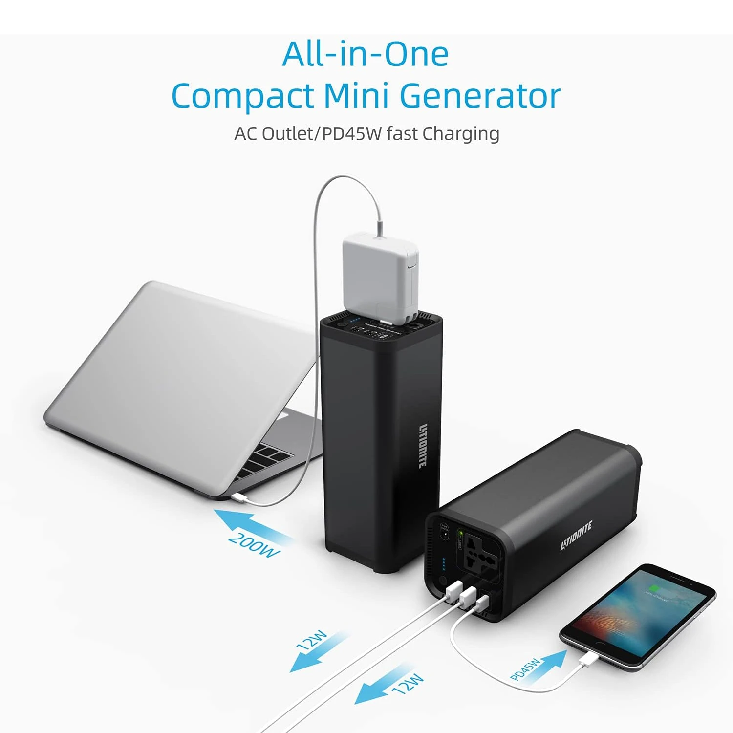 Elle offre trois modes de sortie : 1 prise secteur (200 W), 1 port PD USB Type-C jusqu’à 45 W, et 2 ports de charge USB jusqu’à 12 W. La recharge rapide de cette batterie externe vous permet de la recharger complètement en seulement 5 heures via une prise secteur (19 V/2 A), ou en utilisant un panneau solaire portable en 10 heures ou plus.