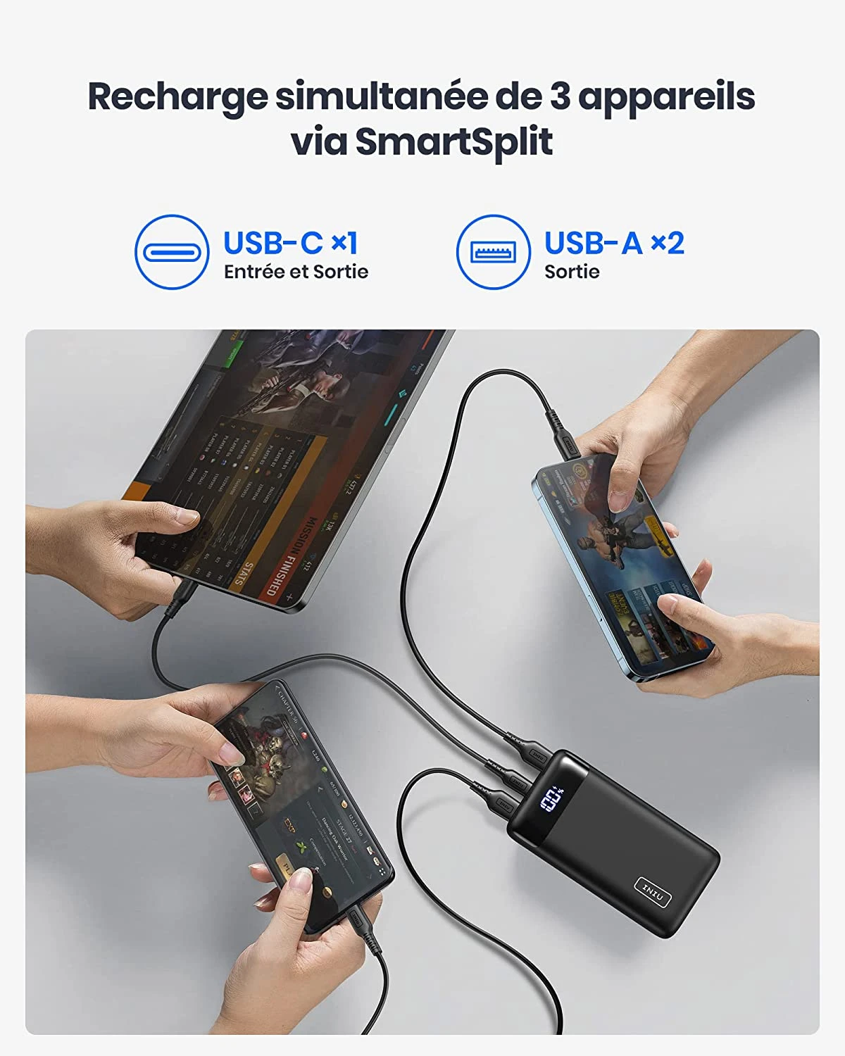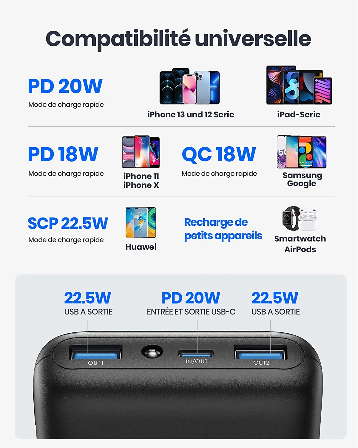 La récente version de notre batterie externe est équipée d’un port bidirectionnel (entrée et sortie) USB-C, ce qui la rend parfaitement compatible avec vos nouveaux iPhone, iPad et tous les appareils USB-C futurs. De plus, avec un port USB-C et deux ports USB intégrés, vous pouvez recharger trois appareils simultanément, ce qui en fait un choix idéal pour partager l’énergie portable avec votre famille et vos amis 👌.