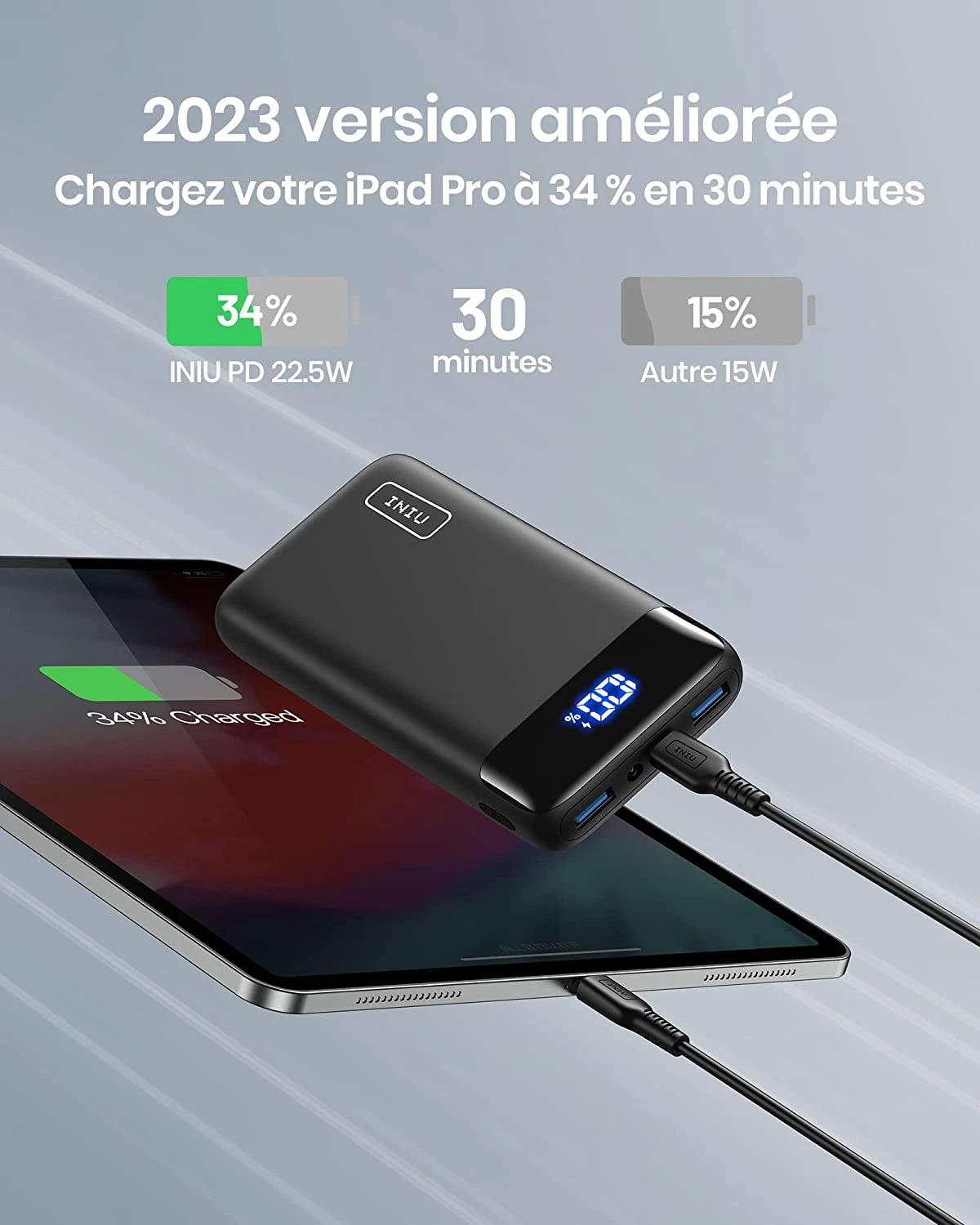 Notre Batterie Portable USB-C est conçue pour une recharge rapide et efficace. Avec une sortie de 22,5 W et les dernières technologies de charge rapide PD 3.0 et QC 4+, vous pouvez recharger votre téléphone jusqu’à 61 % en seulement 30 minutes. De plus, notre modèle est capable de charger votre iPad Pro jusqu’à 34 % en 30 minutes, une performance que la plupart des batteries externes ne peuvent pas égaler.