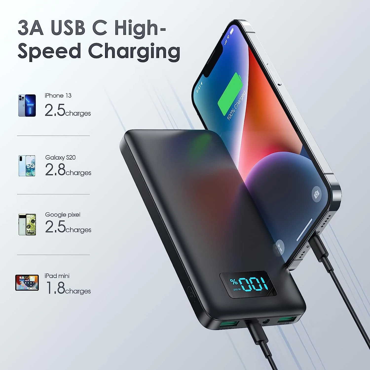 Profitez de la technologie de charge rapide grâce à notre port USB C 5V/3,0A. Cette fonctionnalité garantit une charge plus rapide et plus sécurisée par rapport aux banques d’alimentation traditionnelles. Compatible avec une gamme d’appareils, tels que les iPhones, les Samsung Galaxy, les Pixels, les LG smartphones, et plus encore, notre batterie vous assure que votre téléphone ne tombe jamais à court de batterie.