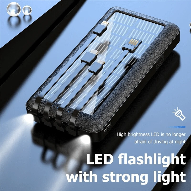 Équipée de quatre câbles de sortie et d’un câble d’entrée intégré, cette batterie solaire est conçue pour vous permettre de recharger plusieurs appareils simultanément. Plus besoin de transporter des câbles supplémentaires, elle vous facilite la vie et vous pouvez même partager l’énergie avec vos amis.