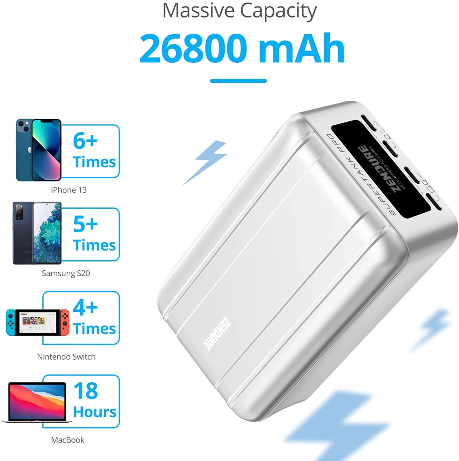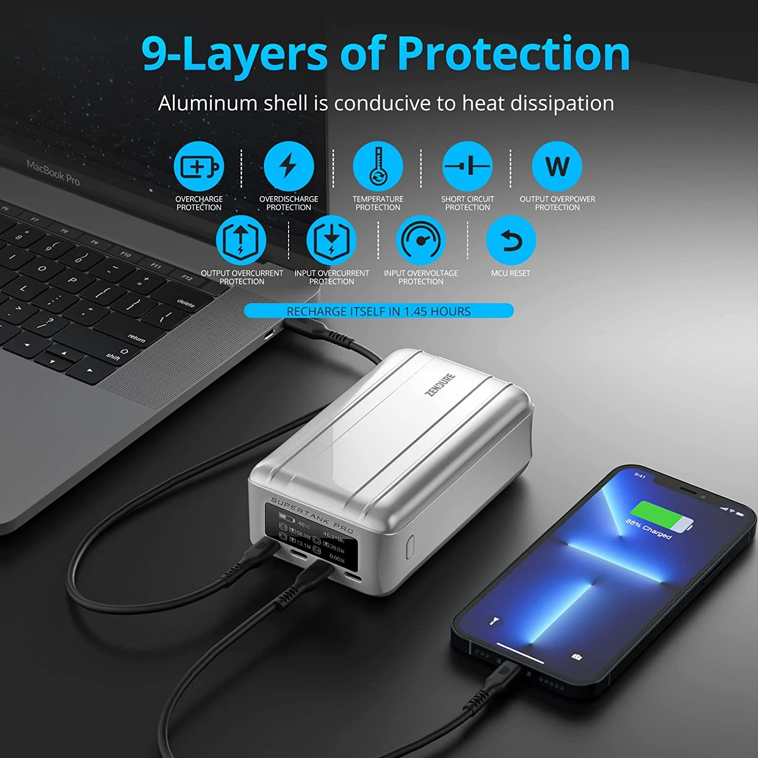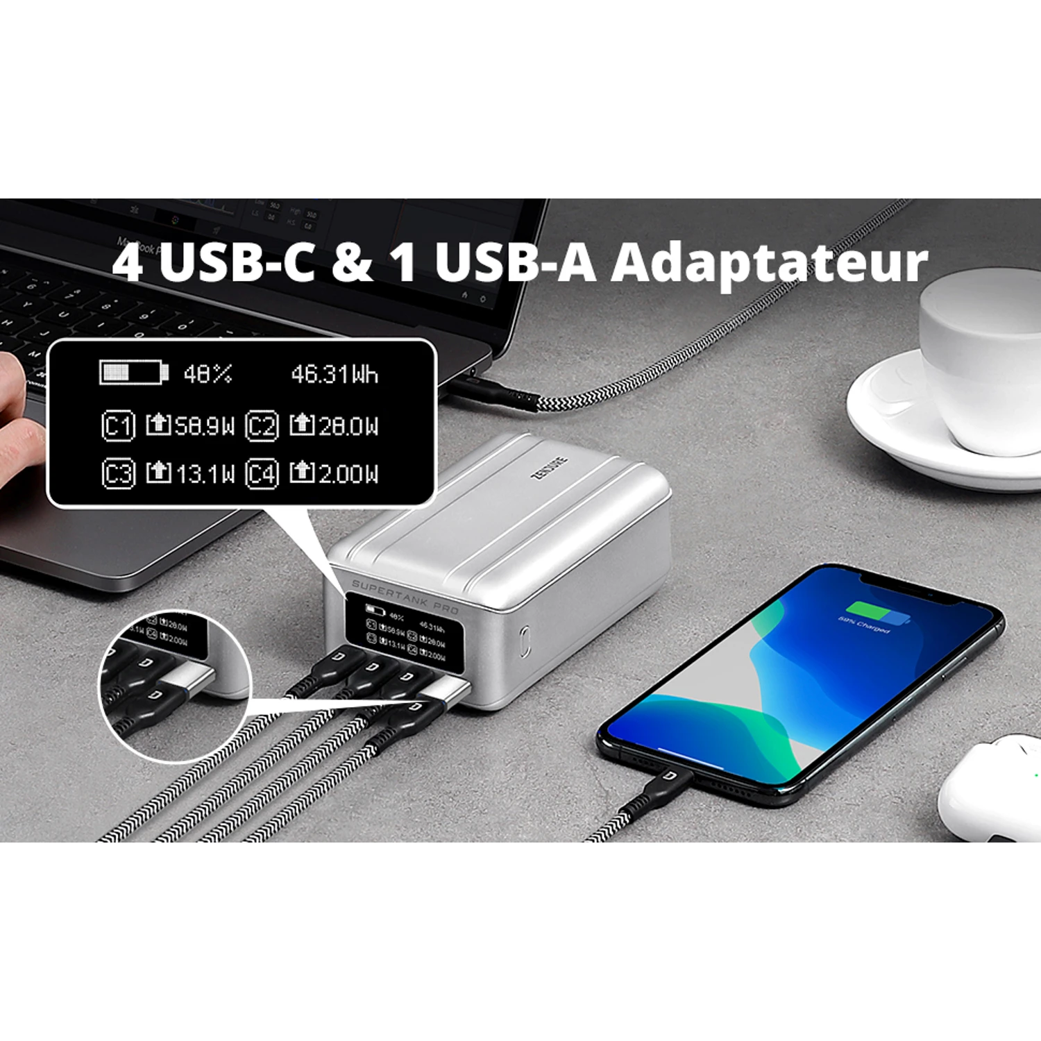 Notre Powerbank Zendure SuperTank Pro de 26800 mAh dispose d’une sortie totale et maximale de 138 Watts et une entrée de 100 Watts. Elle recharge ainsi ultra rapidement n’importe quel téléphone et peut recharger vite des ordinateurs portables ❤️.