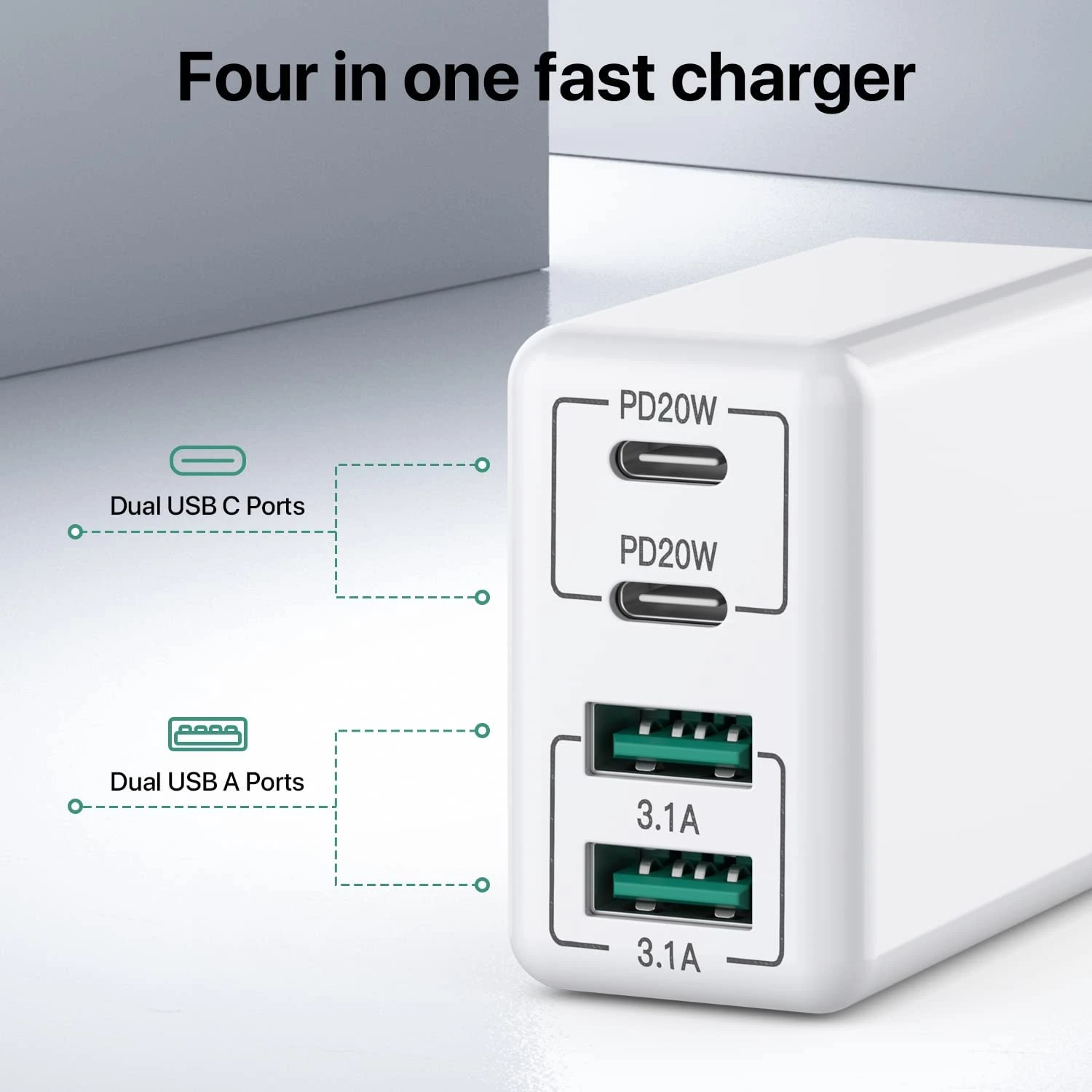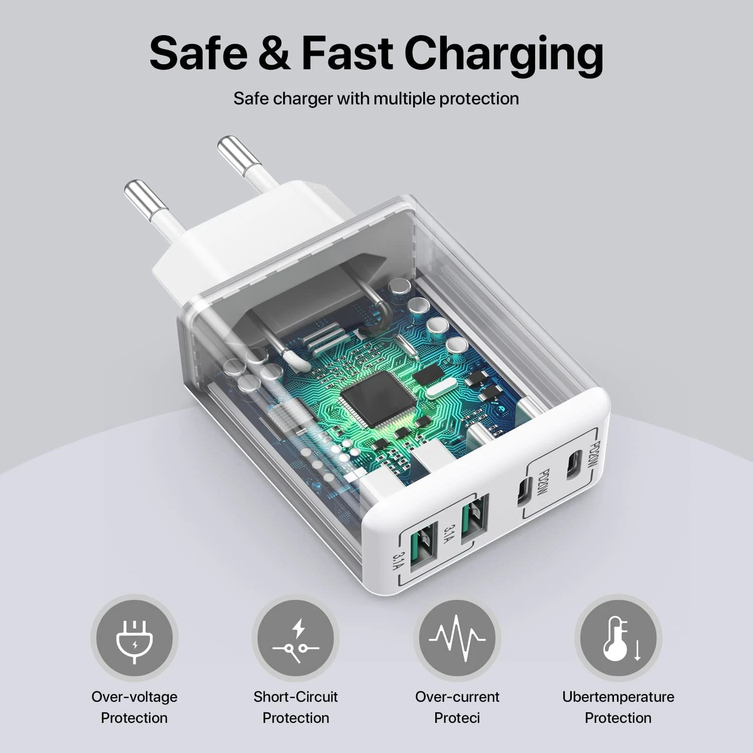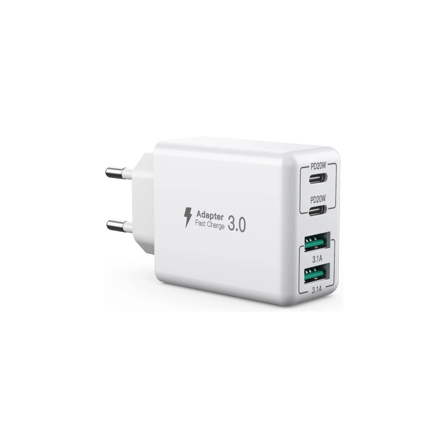 Notre bloc d’alimentation est doté d’un design multiport, comprenant un double port USB-C et deux ports USB-A. Cette conception ingénieuse permet de charger votre téléphone, votre tablette et vos écouteurs simultanément, réduisant ainsi les temps d’attente. De plus, cela vous permet d’économiser de l’espace en évitant d’occuper plusieurs prises murales. Le meilleur remplacement pour votre chargeur USB d’origine.