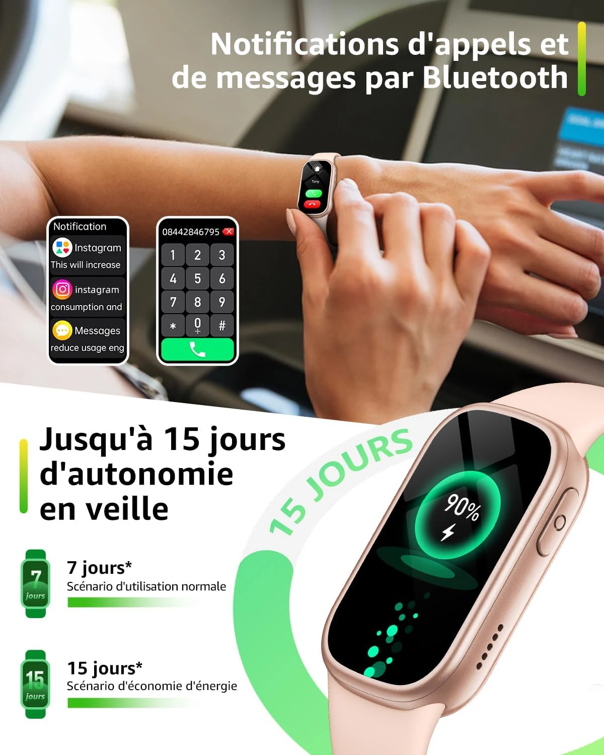 🔥 Notifications et Rappels Intelligents Ne manquez plus aucun message important avec les rappels intelligents pour les appels entrants, les messages texte, les emails, et les notifications des réseaux sociaux comme Facebook, WhatsApp, Instagram, et bien plus encore. Votre bracelet vibre légèrement et émet des invites vocales pour vous avertir.