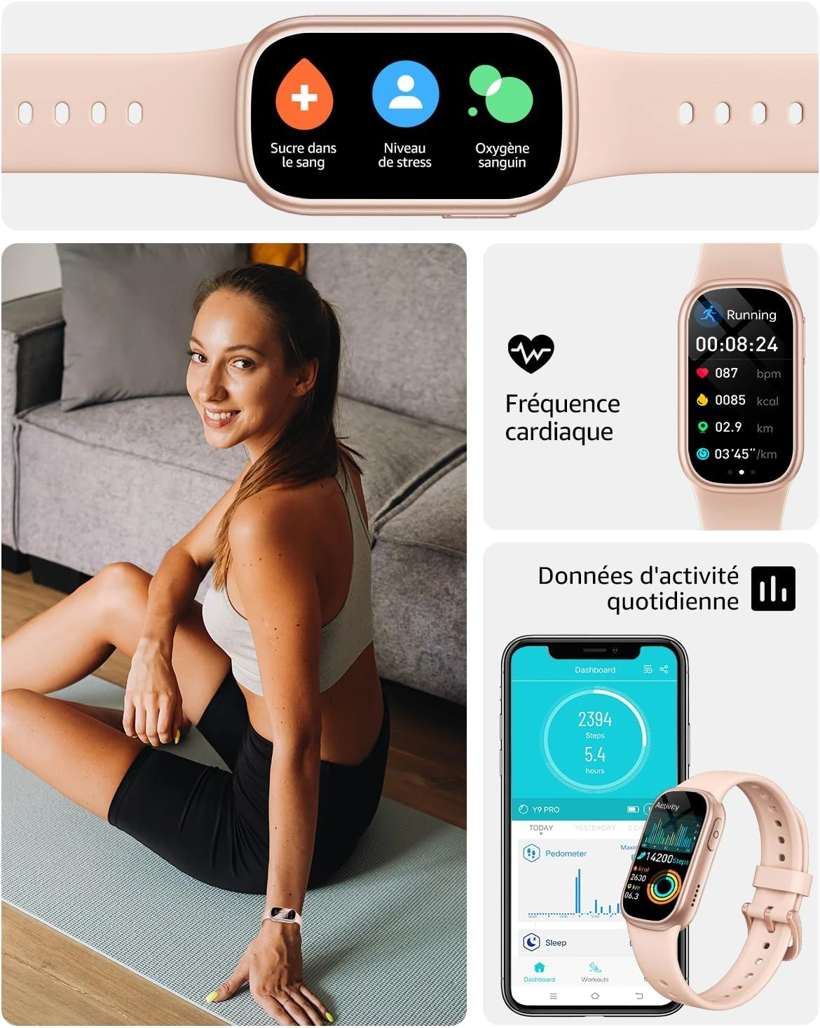 | Suivi du rythme cardiaque / sommeil / taux d’oxygène / sommeil : Oui | |